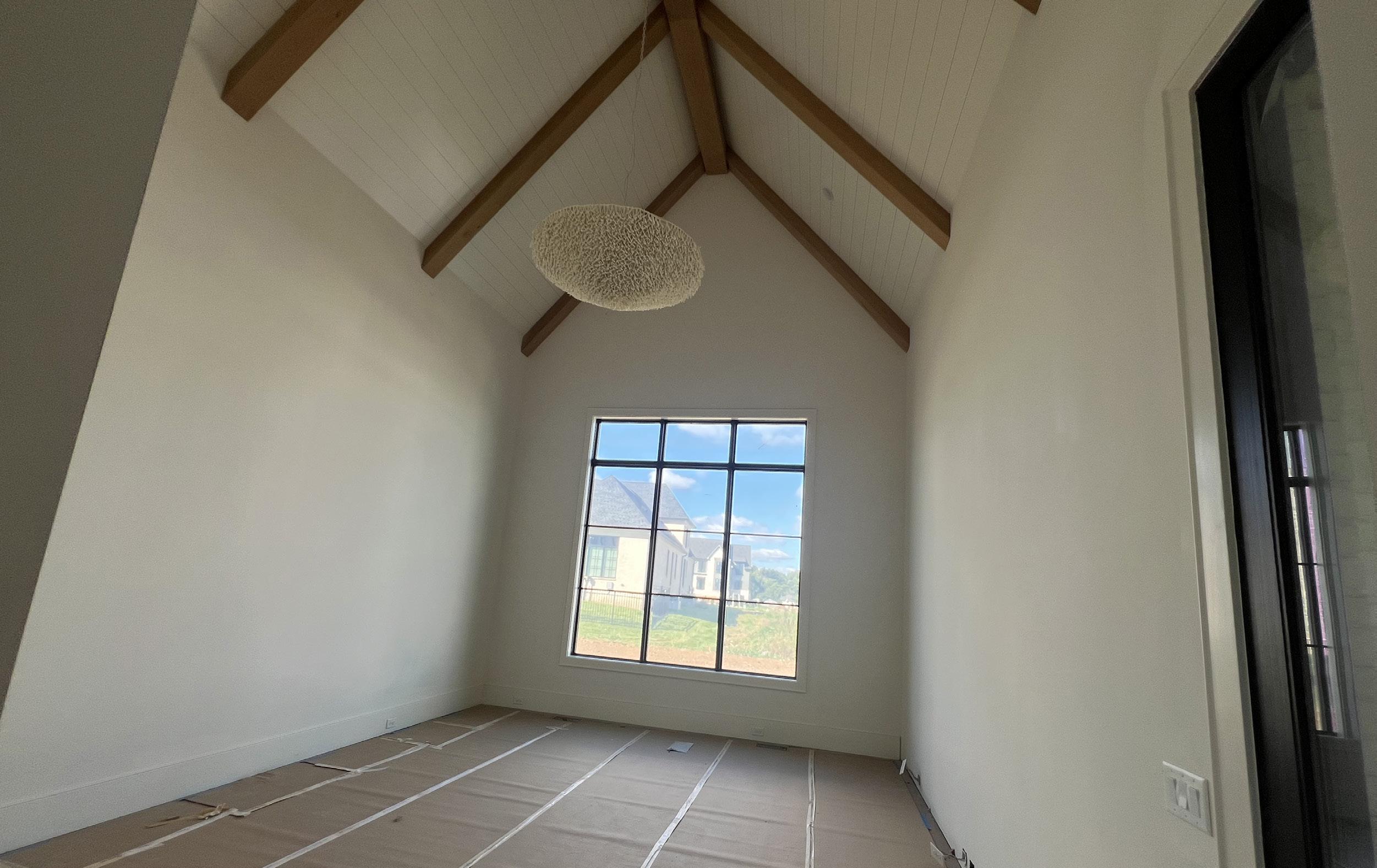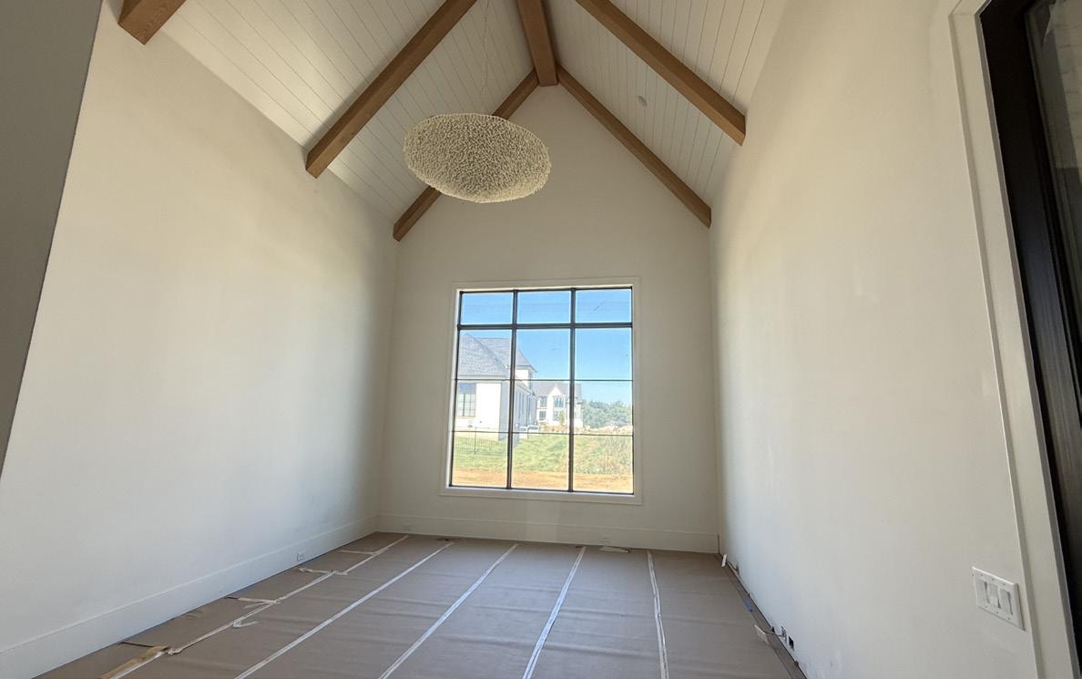 The main-level media room exudes modern elegance with a vaulted ceiling featuring painted shiplap and beam details. Conveniently adjacent to the pool bath, the room offers seamless access to the oversized covered porch, with sliding doors that open directly to the pool area—perfect for entertaining or relaxing while enjoying the indoor-outdoor lifestyle.