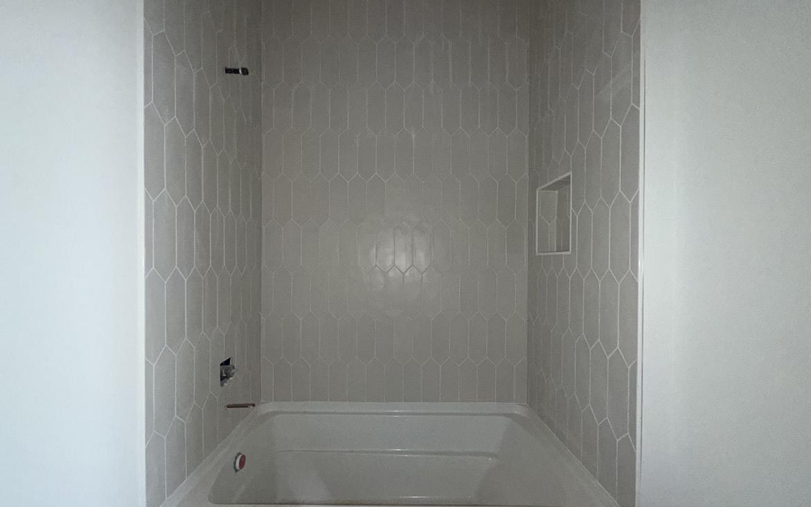 This spacious bedroom offers a private en suite bathroom with a tub-shower combination, featuring a striking rectangular-hexagonal tile surround that extends to the ceiling. A generous walk-in closet with wood shelving provides ample storage, while a unique multicone light fixture adds a modern, artistic touch to the room.