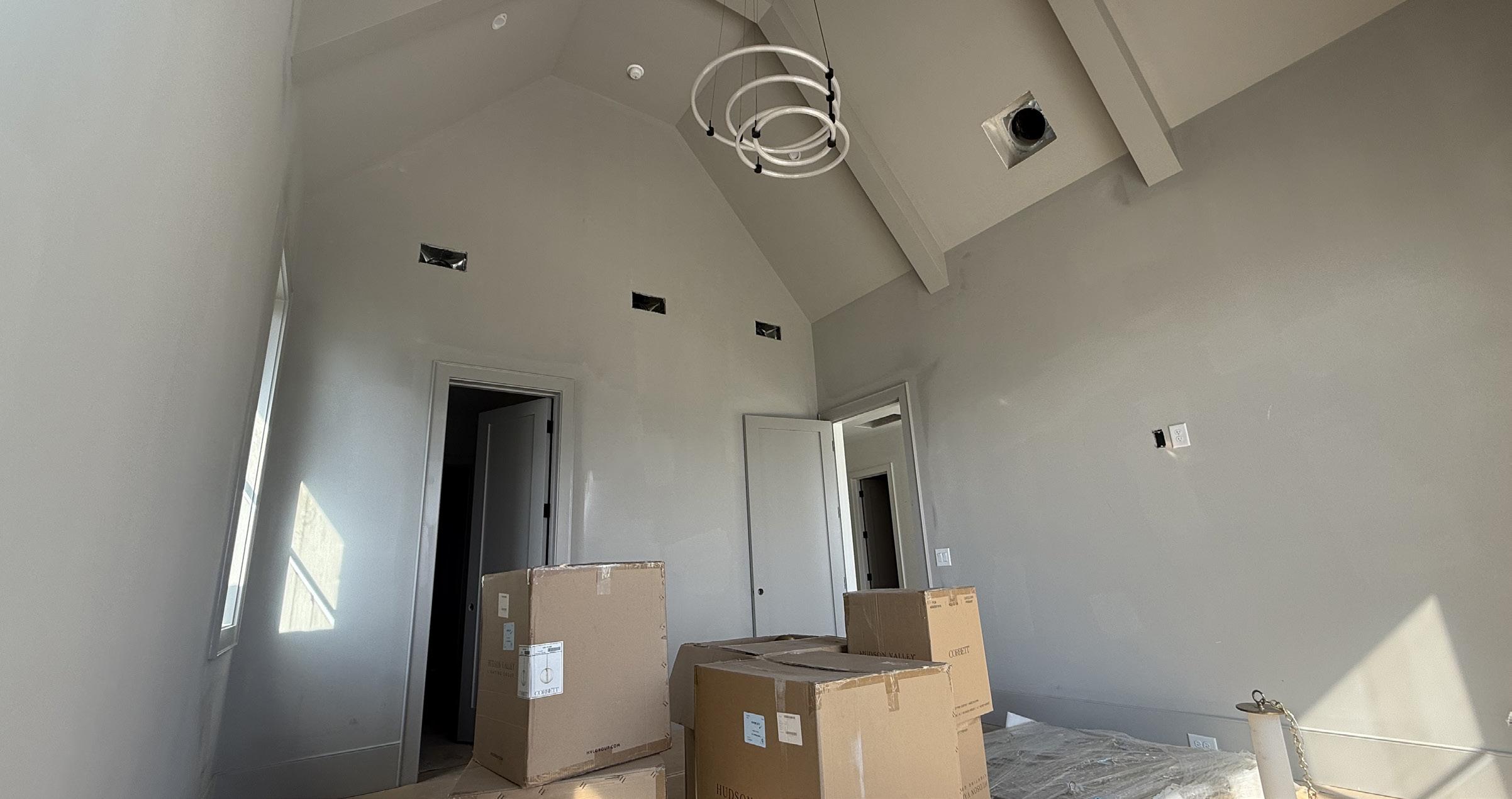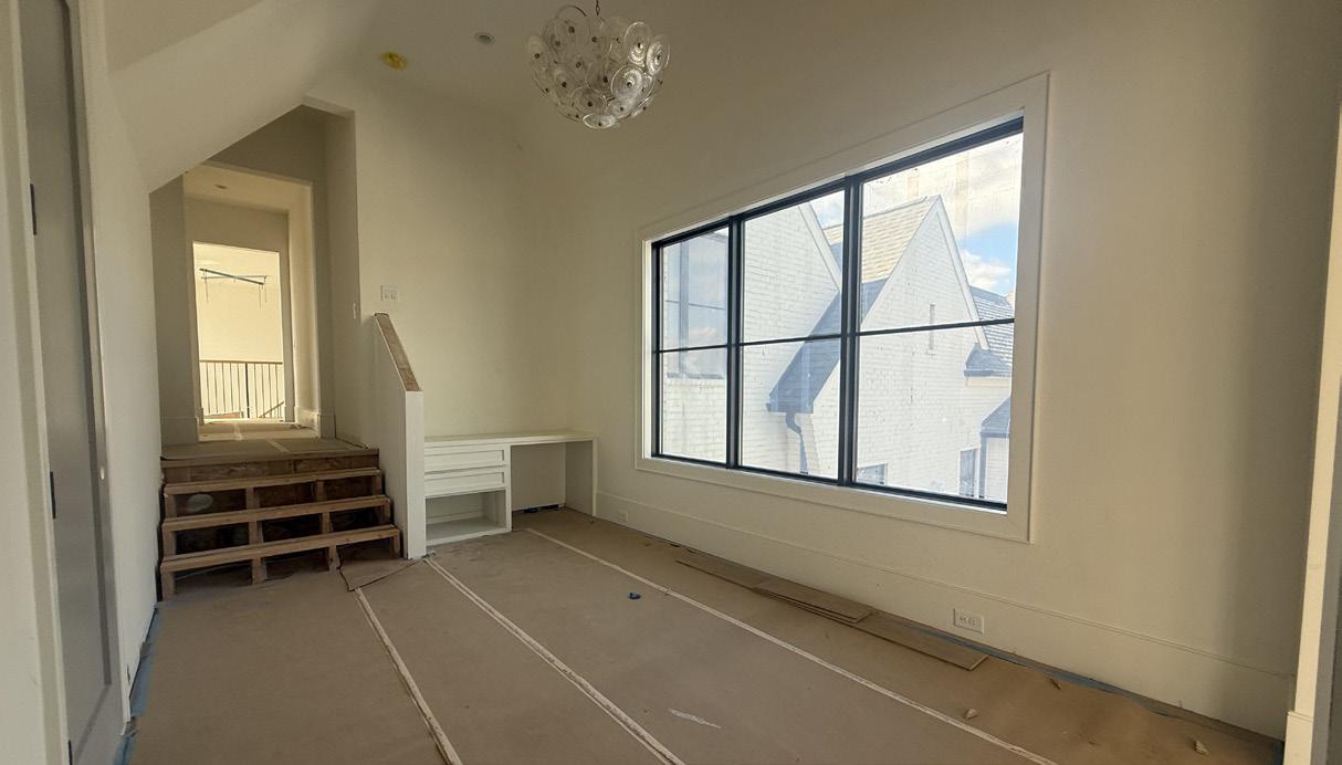 Perched above the porte-cochère, this charming sitting room blends utlity with a clean aesthetic. A built-in desk area offers a dedicated workspace, while an adjacent half bath adds convenience. The vaulted ceiling enhances the sense of space, and a glass-and-gold chandelier—reminiscent of a delicate flower—adds a whimsical, refined touch.