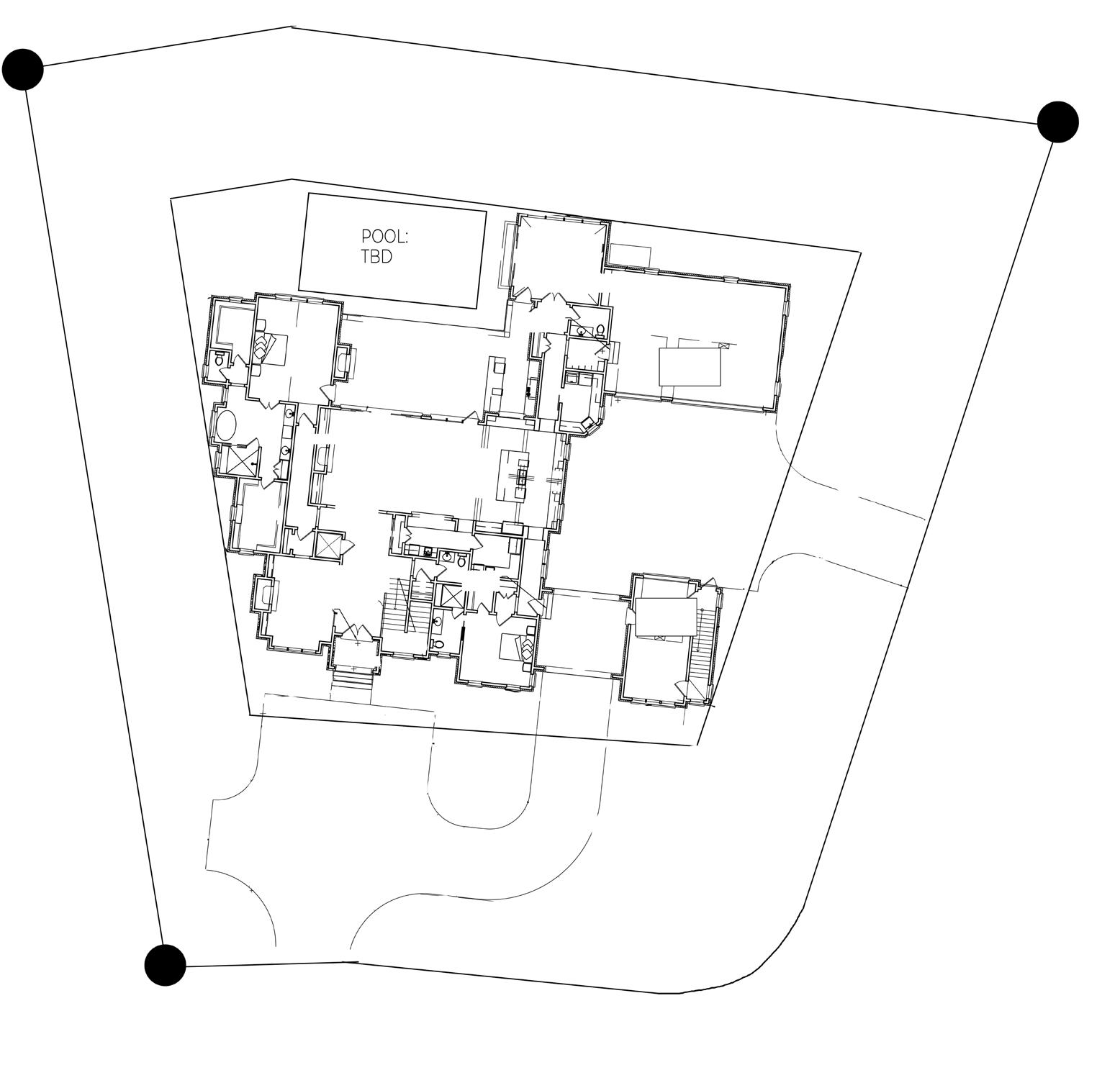 • Main-level media room with vaulted ceiling, beam details, pool bath, and direct pool access