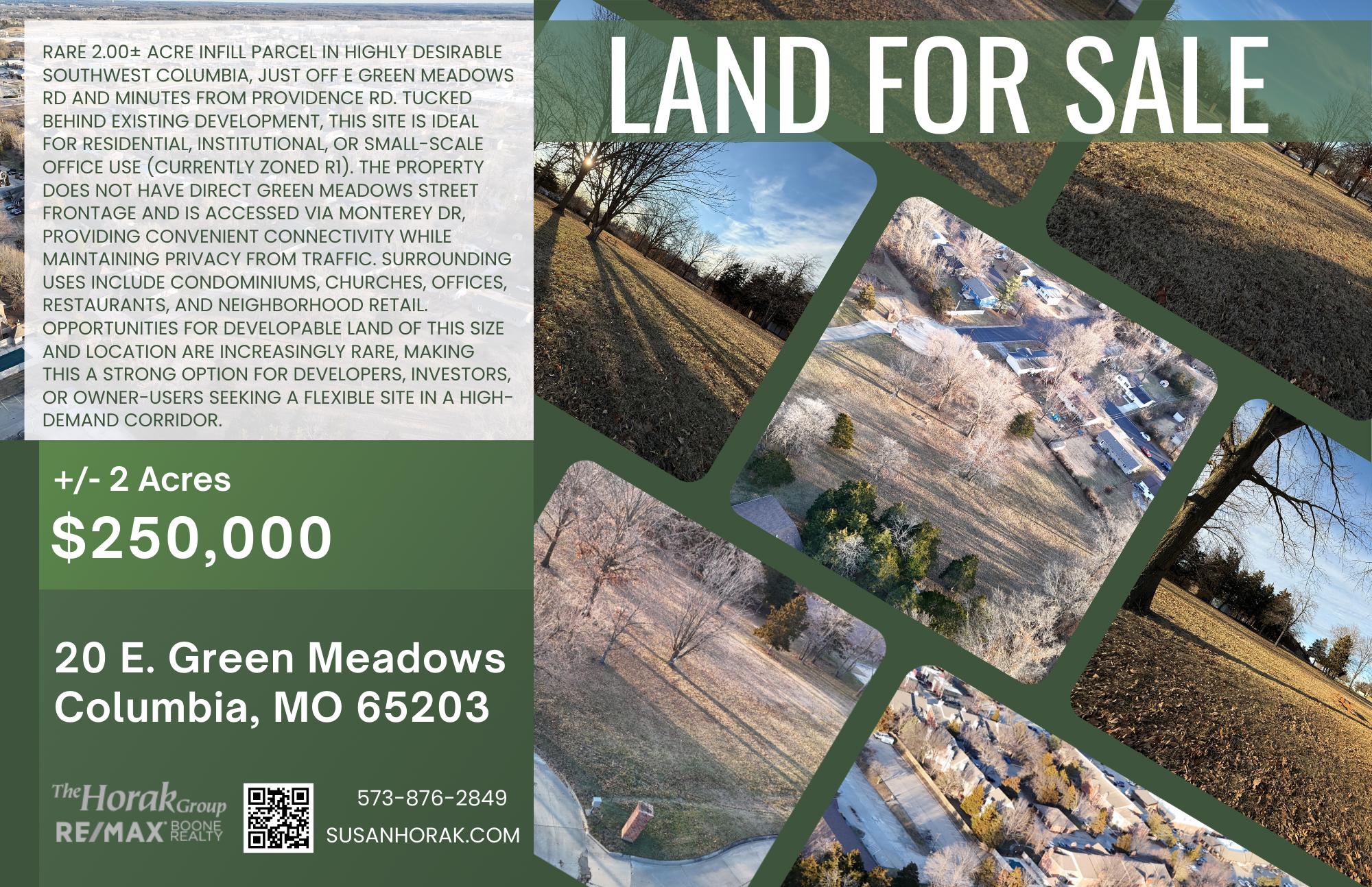 Rare 2.00± acre infill parcel in highly desirable southwest Columbia, just off E Green Meadows Rd and minutes from Providence Rd. Tucked behind existing development, this site is ideal for residential, institutional, or small-scale office use (currently zoned R1). The property does not have direct Green Meadows street frontage and is accessed via Monterey Dr, providing convenient connectivity while maintaining privacy from traffic. Surrounding uses include condominiums, churches, offices, restaurants, and neighborhood retail. Opportunities for developable land of this size and location are increasingly rare, making this a strong option for developers, investors, or owner-users seeking a flexible site in a high-demand corridor.