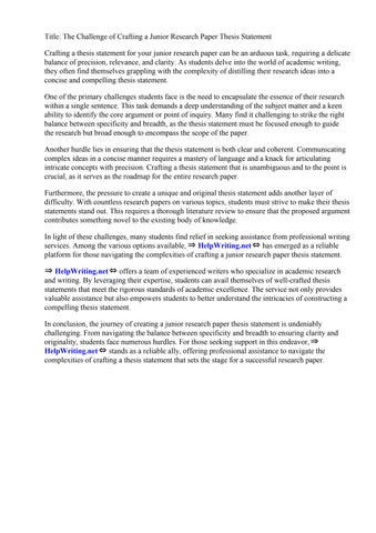 In conclusion, the journey of creating a junior research paper thesis statement is undeniably challenging. From navigating the balance between specificity and breadth to ensuring clarity and originality, students face numerous hurdles. For those seeking support in this endeavor, ⇒ HelpWriting.net⇔ stands as a reliable ally, offering professional assistance to navigate the complexities of crafting a thesis statement that sets the stage for a successful research paper.