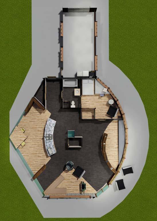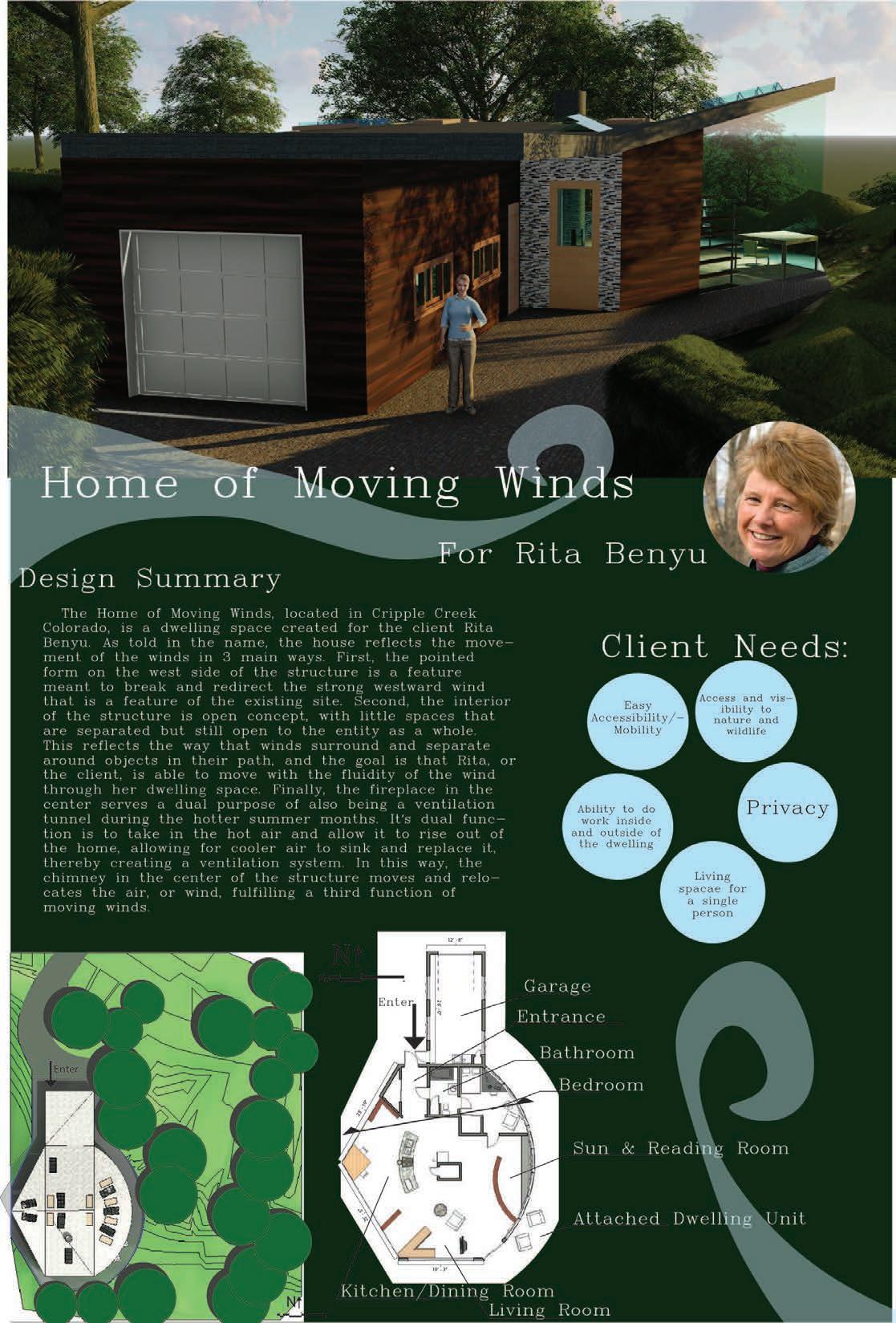 The House of Moving Winds is a dwelling space designed for Rita Benyu, and made up client. The shape and interior of the structure is designed around the idea of moving the winds around it as well as moving the wind within it. There are moves to incorporate nature and privacy into the building as much as possible in accordance with the client’s desires.