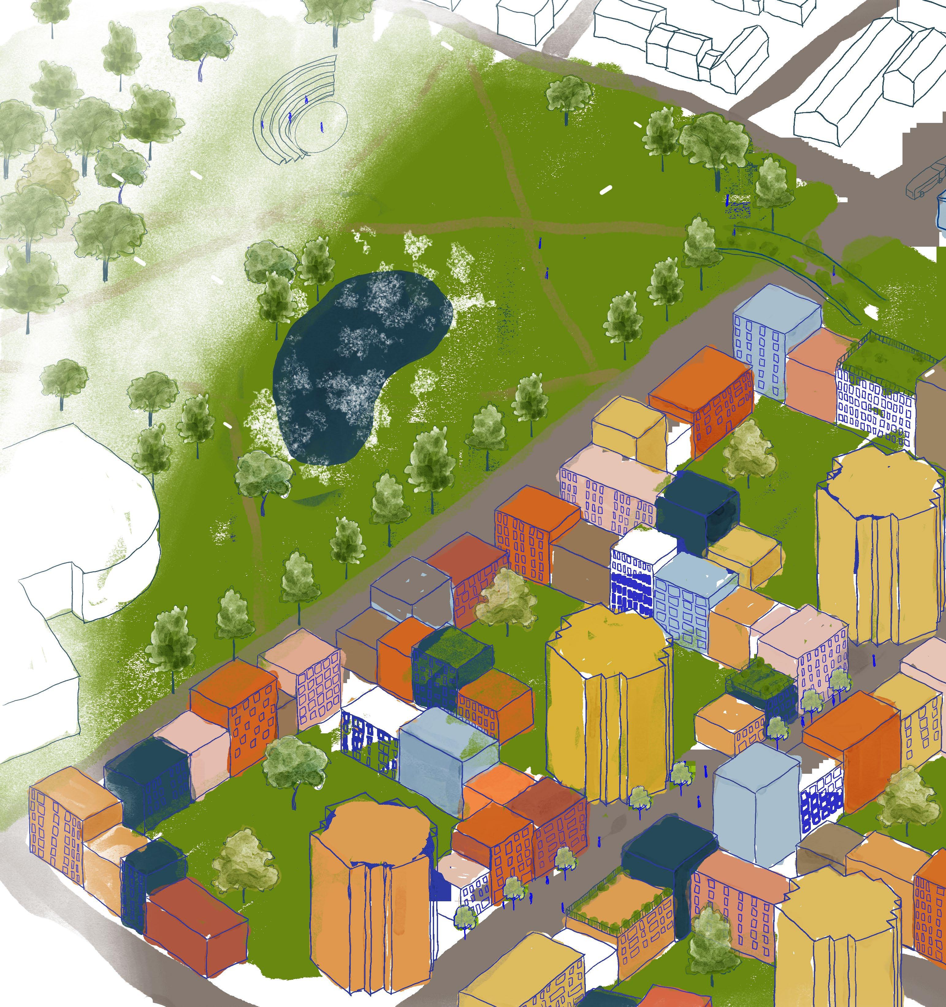 Vår utopiske ide var basert på ei realistisk bydelsplan som ville gli saman med det eksisterande og skape nye bygde miljø med eit livleg byliv.