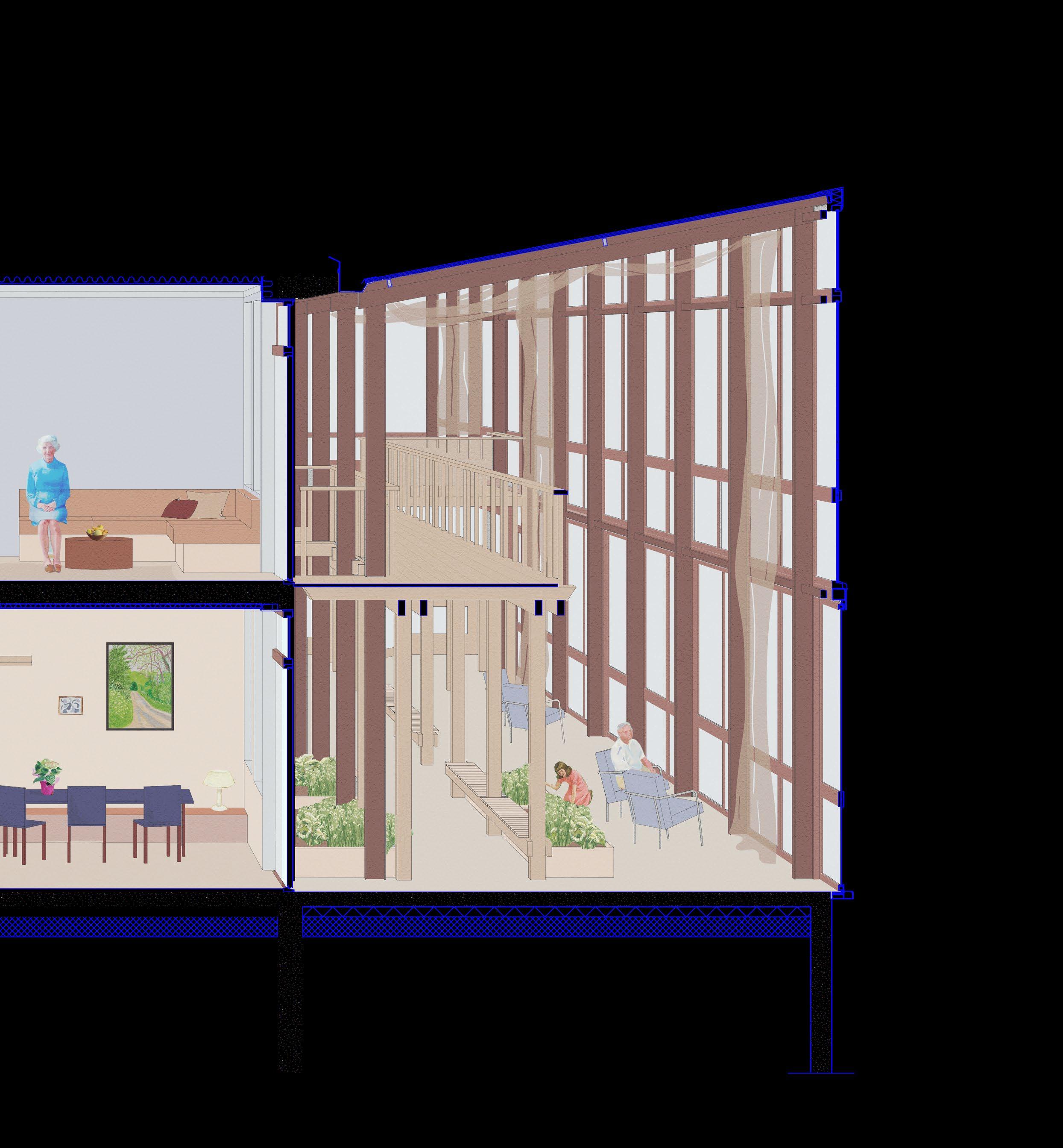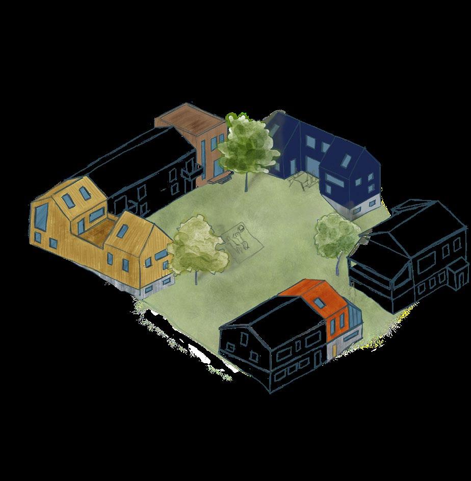 Det blir etablert eit drivhus som vert eit møtepunkt for barna og bebuarane, og som er ei sone for matproduksjon, avslapping og leik. Drivhuset har store skyvedører som gjer at ein kan opne opp delar av fasaden ut mot hagen der det er frukttrær, bærbusker, samt hønsehus og leikeareal.