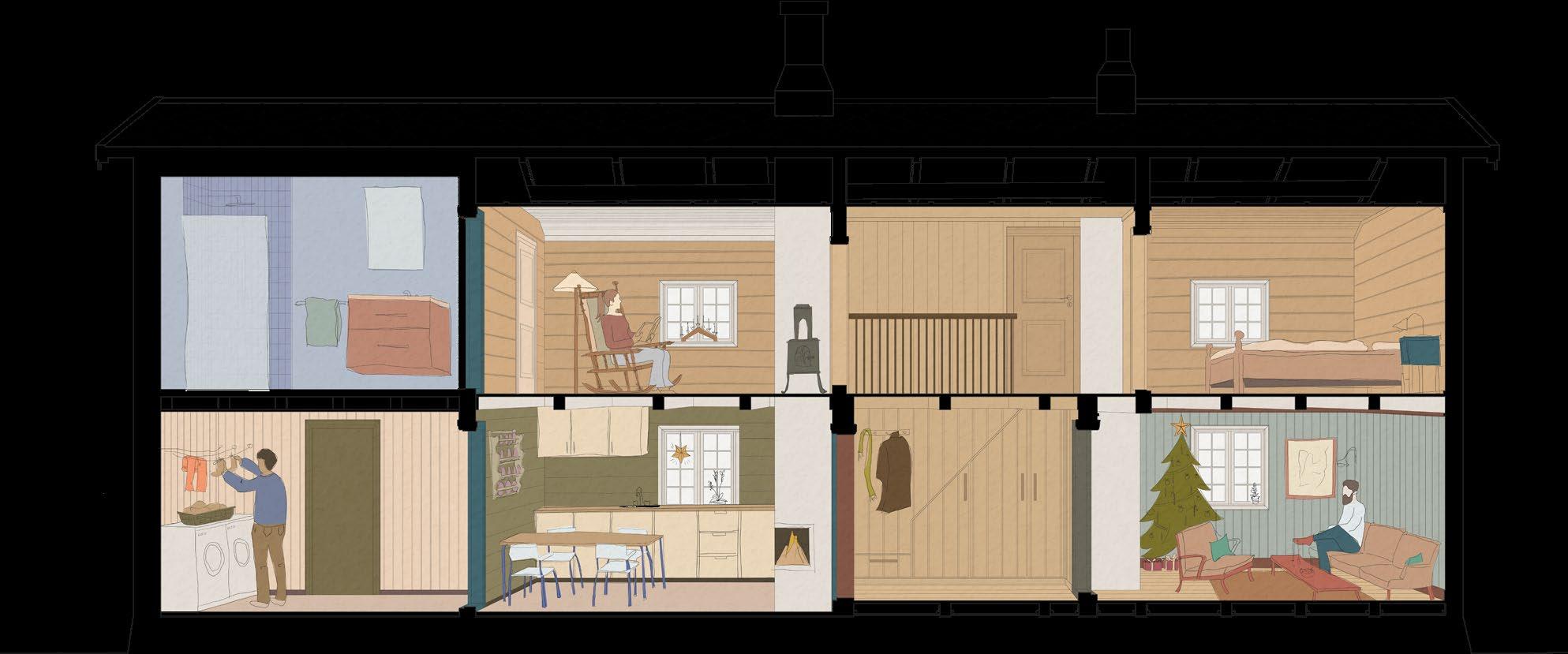 The ceiling height is generally low in the housing blocks, opening up between two and two floors will give an airy and light feeling to parts of the structure. Which will be a contrast to the otherwise intimate spaces in the building.