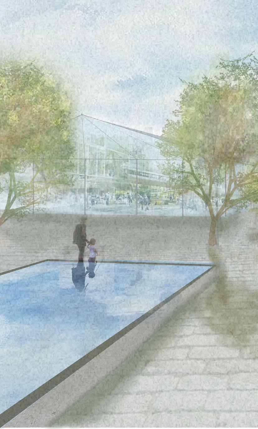 Torget vil bestå av eit samfunnshus, ein mathall, og vil ha tett tilknyting til den grøne korridoren. Torget vil vere ein stad ein kan opphalde seg utan å måtte kjøpe noko. Samfunnshuset kan inkludere tilbod som språkkafé, bibliotek, festsal og kino. Mathallen vil bli ein arena der både små og store, ferske og erfarne lokale aktørar kan selje råvarer og matrettar. Mathallen er plassert slik at den er innbydande både frå parken og gågata. Dørene kan opnast på langsida slik at det blir ei forlenging av torget. Vasspeilet i sentrum av plassen vil ha fontener om sommaren og bli forvandla til skøytebane om vinteren. Det blir moglegheiter for å setje opp bodar som kan nyttast til alt frå loppemarknad og issal om sommaren til kakaosal og skøyteutleige om vinteren.