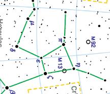 This cluster of stars is a fuzzball object visible in binoculars. It is located at this time of year high in the northwest not far from the very bright star Vega. It is located in the body of Hercules, a four star squarish trapezoid shape (see star chart at left for location of M13). A small telescope will reveal this as a dense pack of stars. It’s quite a beautiful sight to behold. The chart also shows the location of M92, another globular cluster. It, too, is a pretty sight to see. •••