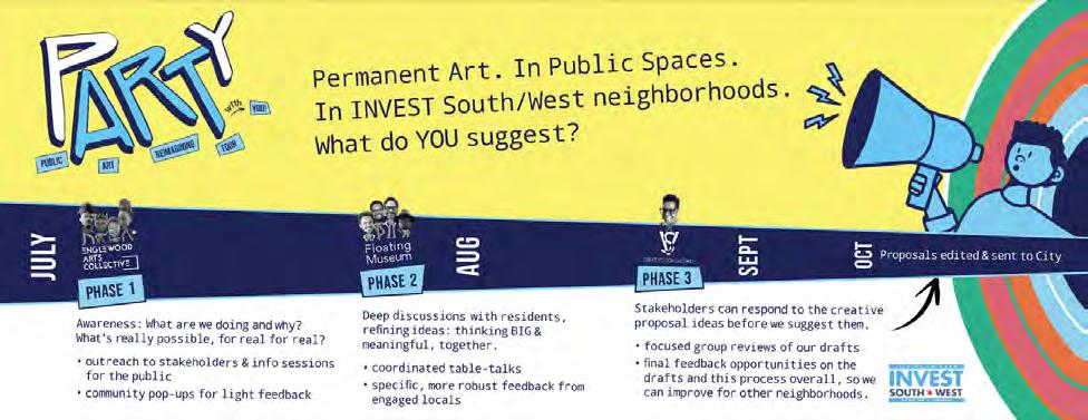 Created by the City of Chicago, INVEST South/West is an unprecedented community improvement initiative that seeks to strategically reverse decades of systemic public and private disinvestment in the city’s West and South Side neighborhoods. The City’s Department of Cultural Affairs and Special Events (DCASE) commissioned Borderless Studio and PORT to create a community engagement campaign to guide a Public Art Vision Plan for each INVEST South/ West neighborhood. The artist-led campaign, titled Public Art Reimagining Tour with You (P.A.R.T.Y.), utilizes fun colors and graphics, approachable and accessible language, and consistent and recognizable branding to attract attention, increase awareness, and gather community input.
