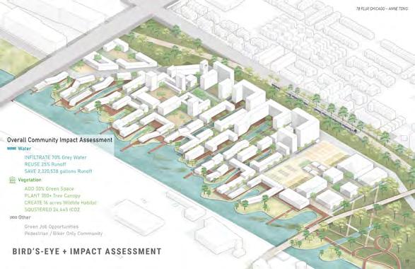 There are currently 77 neighborhoods in Chicago. This will be the 78th. The proposed project, 78 Flux Chicago, followed the geodesignbased approach to address environmental problems within the city of Chicago. The 62-acre site located along a half-mile of the riverfront will fuse new homes, commercial enterprises, cultural events, academia, and outdoor recreational space. The design aims to address how landscape infrastructures, ecological systems, and urban fabric respond to extreme circumstances, particularly flood and drought, which are increasingly common in the region.