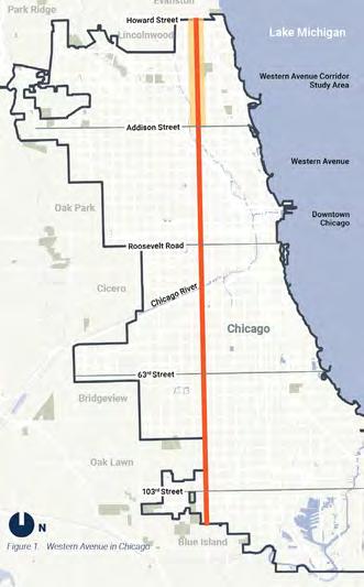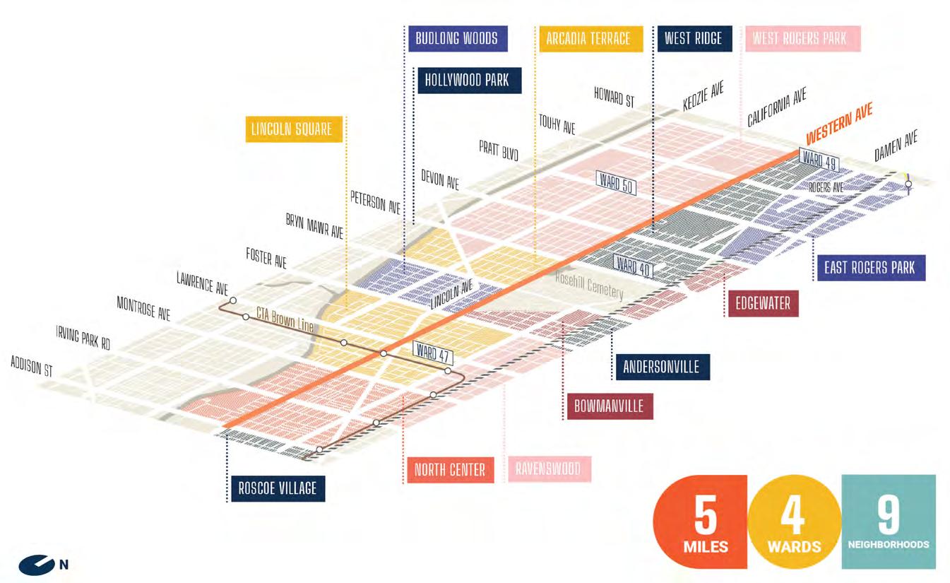 Adopted in 2022, the Western Avenue Corridor Study is a communitybased planning initiative to envision an equitable, long-term future for a five-mile section of North Western Avenue, from Addison Street to Howard Street in Chicago. The study was developed through a robust community-led process to guide development, transportation, mobility, and public-realm improvements along the corridor, with the goal of supporting a thriving, safe, and resilient Western Avenue that meets a range of community needs.