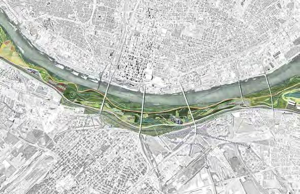 This is an 11-mile stretch on the flood-prone eastern bank of the Mississippi River, just across from Gateway Arch National Park. The development of an urban-scale riparian corridor design bolsters Illinois’ river cities against climate threats while interrogating social, cultural, and economic issues that have plagued the site’s adjacent communities and imagining potential remediation for those issues through storytelling.