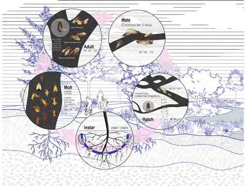 This project proposes landscape design guidelines and policy recommendations that anticipate the arrival of the 17-year periodical cicada in 2024. Using a 2.25-mile-long stretch of Peterson Avenue in Chicago as a case study, the design will rethink standard urban elements such as sidewalks, parkways, rooftops, front lawns, backyards, and public parks in ways that preserve and enhance cicada habitat from 2024 onward. STUDENT HONOR