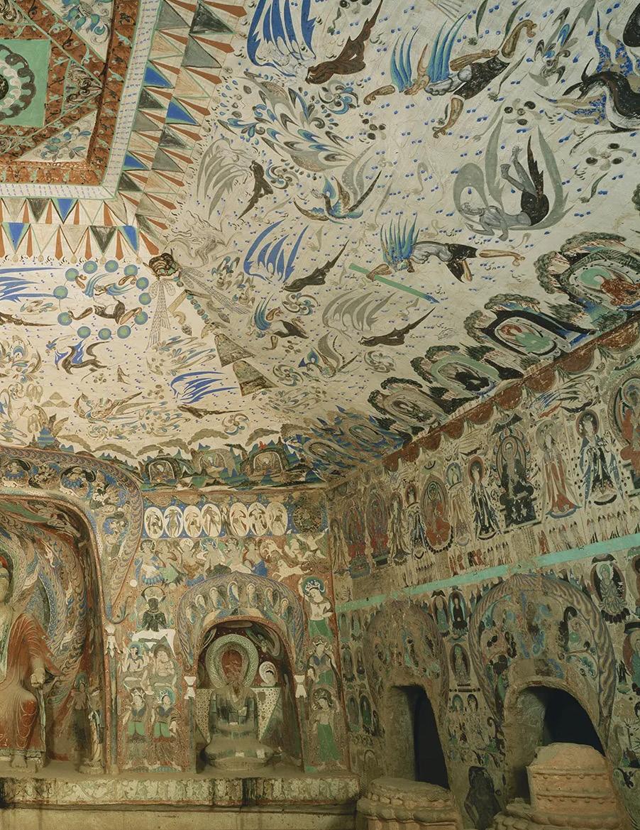 In 2018, Julie Mehretu visited the famous Mogao Grottoes near Dunhuang in northwest China. Situated on the edge of the Gobi Desert, Dunhuang was an important oasis and a locus of commercial and cultural exchange on the northern route of the fabled trade roads collectively referred to as the Silk Road. In the fourth century, Buddhist monks began excavating rock-cut temples in a nearby escarpment, and over the following millennium, nearly 500 caves would be cut into the cliff face. Many were extravagantly decorated—the murals cover some 45,000 m² (about an acre’s worth) of walls and ceilings. There are buddhas by the thousands; bodhisattvas and flying apsaras trailing ribbons of cloud; paradisiacal landscapes dotted with mountains, rivers, and pavilions where musicians play and the Buddha holds court with the enlightened.