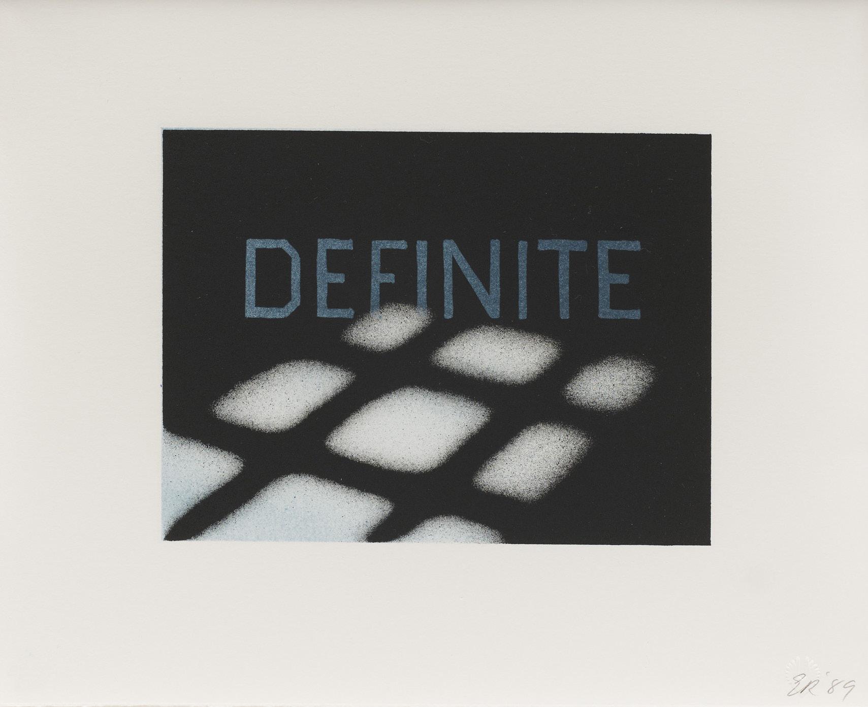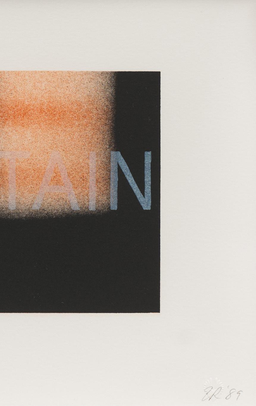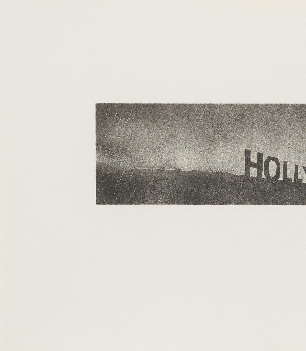 When Ruscha was awarded a fellowship at Tamarind Lithography Workshop in 1969, he continued to explore Hollywood as a subject. Working closely with master printer Donald Kelley, he executed Hollywood in the Rain and Hollywood with Observatory, two rare black-and-white lithographs of the landmark. Like Hollywood, Hollywood in the Rain utilizes a sunken perspective, yet the lithograph assumes an uncharacteristically film-noir aesthetic that highlights Ruscha’s embrace of printmaking as a means to formally experiment with his recurring themes.
