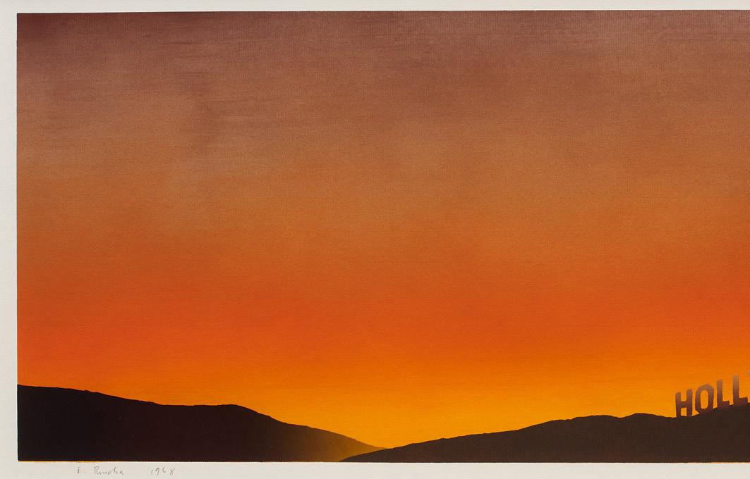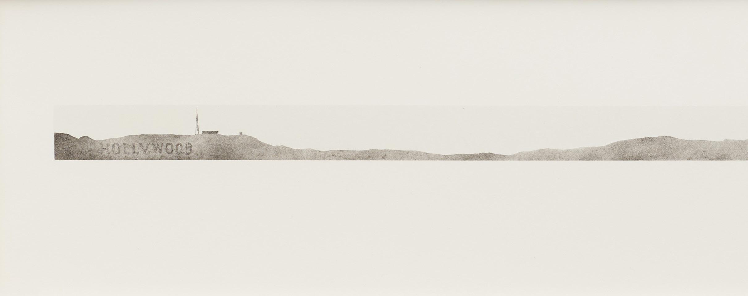 Hollywood with Observatory, which features both the Hollywood Sign and the Griffith Observatory, is Ruscha’s only print that correctly situates the Hollywood Sign. Here, he employs an exaggerated horizontal format to highlight the mountainous topography of Los Angeles in a strip-like composition that recalls his 1966 book Every Building on the Sunset Strip. In the book, Ruscha photographed every storefront on the two-mile strip from a moving truck, creating a continuous reel of images.