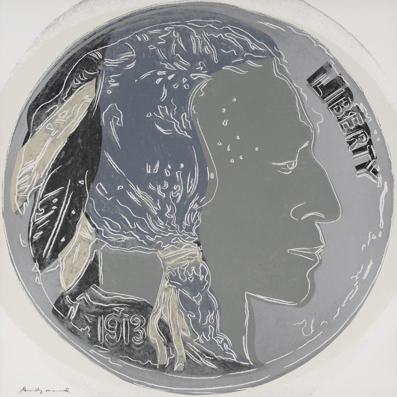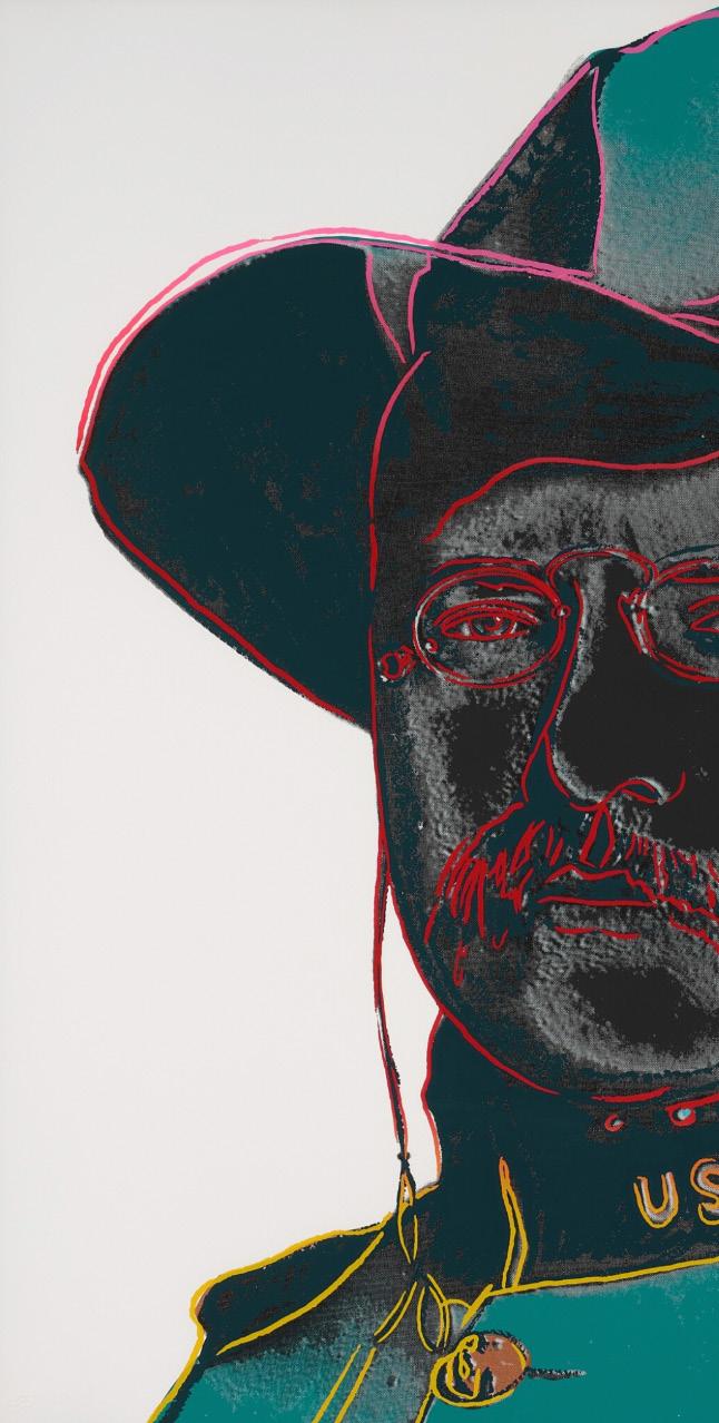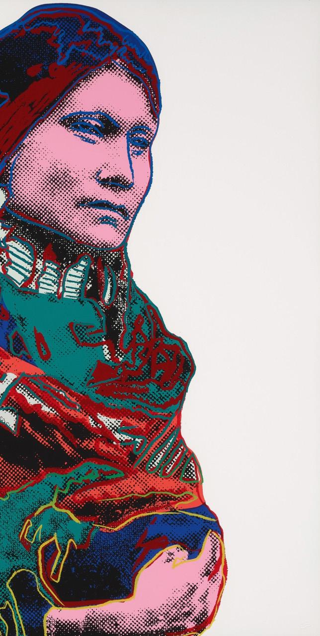 The Wild West emerged as a popular trope in modern visual culture in the 20th century. It flourished in film and television, where creative license granted a particular dramatization of the history of westward expansion in the United States. The Western, as the genre came to be known, was defined by frontier fantasies of lawlessness and conflict. A “Cowboys and Indians” narrative was common, and supplied a hero-versusvillain dynamic in the form of settlers against Native Americans. This mythology was an enduring source of fascination for Andy Warhol: he collected Native American crafts, wore cowboy boots, and directed his own Western, Lonesome Cowboys (1968), which satirized the genre’s machismo with a homoerotic portrayal of the cowboy and prompted an FBI investigation into the artist.