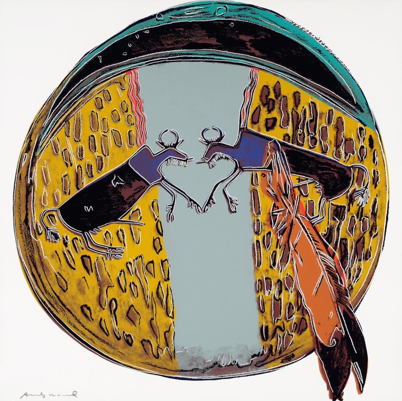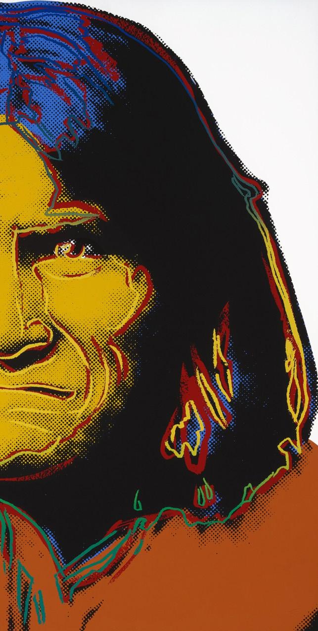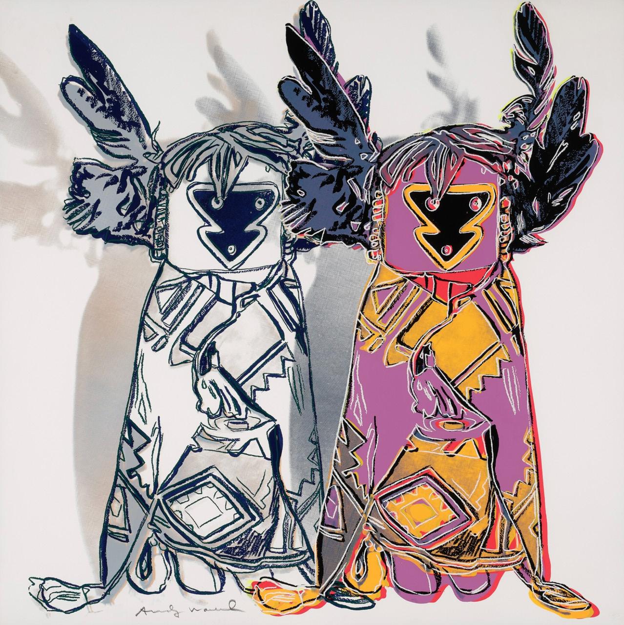 In Cowboys and Indians, one of Warhol’s last major printmaking projects before his death in 1987, he returned to the mythology of the American West. The portfolio of ten screenprints brings figures from Western cinema and American history together with objects of Indigenous culture. Warhol’s images have various sources. Kachina Dolls, Plains Indian Shield, and Northwest Coast Mask are Native American artifacts that Warhol photographed at the Museum of the American Indian, Heye Collection in New York, now the Smithsonian National Museum of the American Indian, while Teddy Roosevelt, General Custer, and Geronimo are appropriated from archival photographs. For Western film icon John Wayne and sharpshooter-turned-vaudeville star Annie Oakley, Warhol used promotional images from Wayne’s 1962 film The Man Who Shot Liberty Valance and Oakley’s advertisements for Buffalo Bill’s Wild West show. Warhol’s equal manipulation of each image suggests that there is little distinction between the stereotypes we maintain and the heroes we uphold.