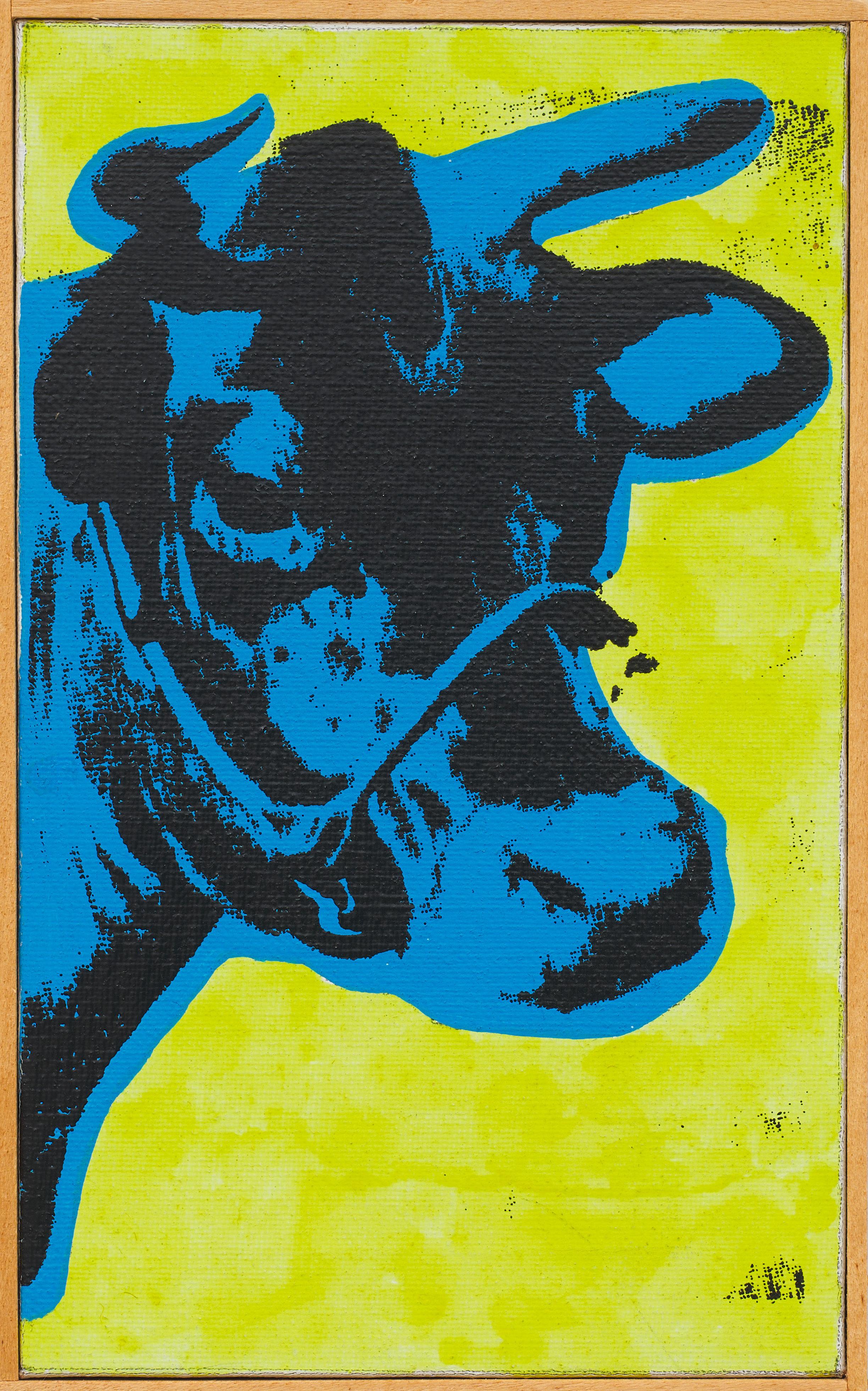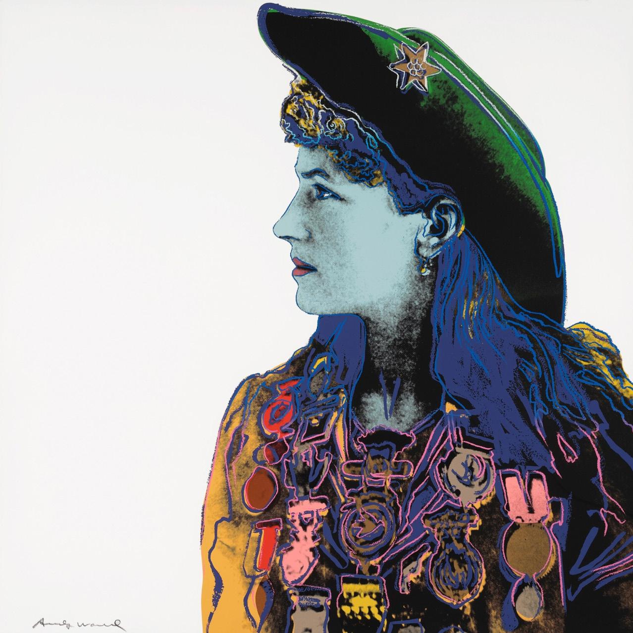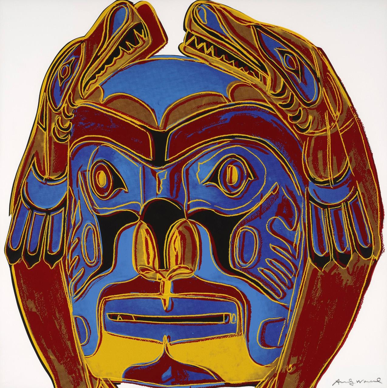 In Cowboys and Indians, one of Warhol’s last major printmaking projects before his death in 1987, he returned to the mythology of the American West. The portfolio of ten screenprints brings figures from Western cinema and American history together with objects of Indigenous culture. Warhol’s images have various sources. Kachina Dolls, Plains Indian Shield, and Northwest Coast Mask are Native American artifacts that Warhol photographed at the Museum of the American Indian, Heye Collection in New York, now the Smithsonian National Museum of the American Indian, while Teddy Roosevelt, General Custer, and Geronimo are appropriated from archival photographs. For Western film icon John Wayne and sharpshooter-turned-vaudeville star Annie Oakley, Warhol used promotional images from Wayne’s 1962 film The Man Who Shot Liberty Valance and Oakley’s advertisements for Buffalo Bill’s Wild West show. Warhol’s equal manipulation of each image suggests that there is little distinction between the stereotypes we maintain and the heroes we uphold.