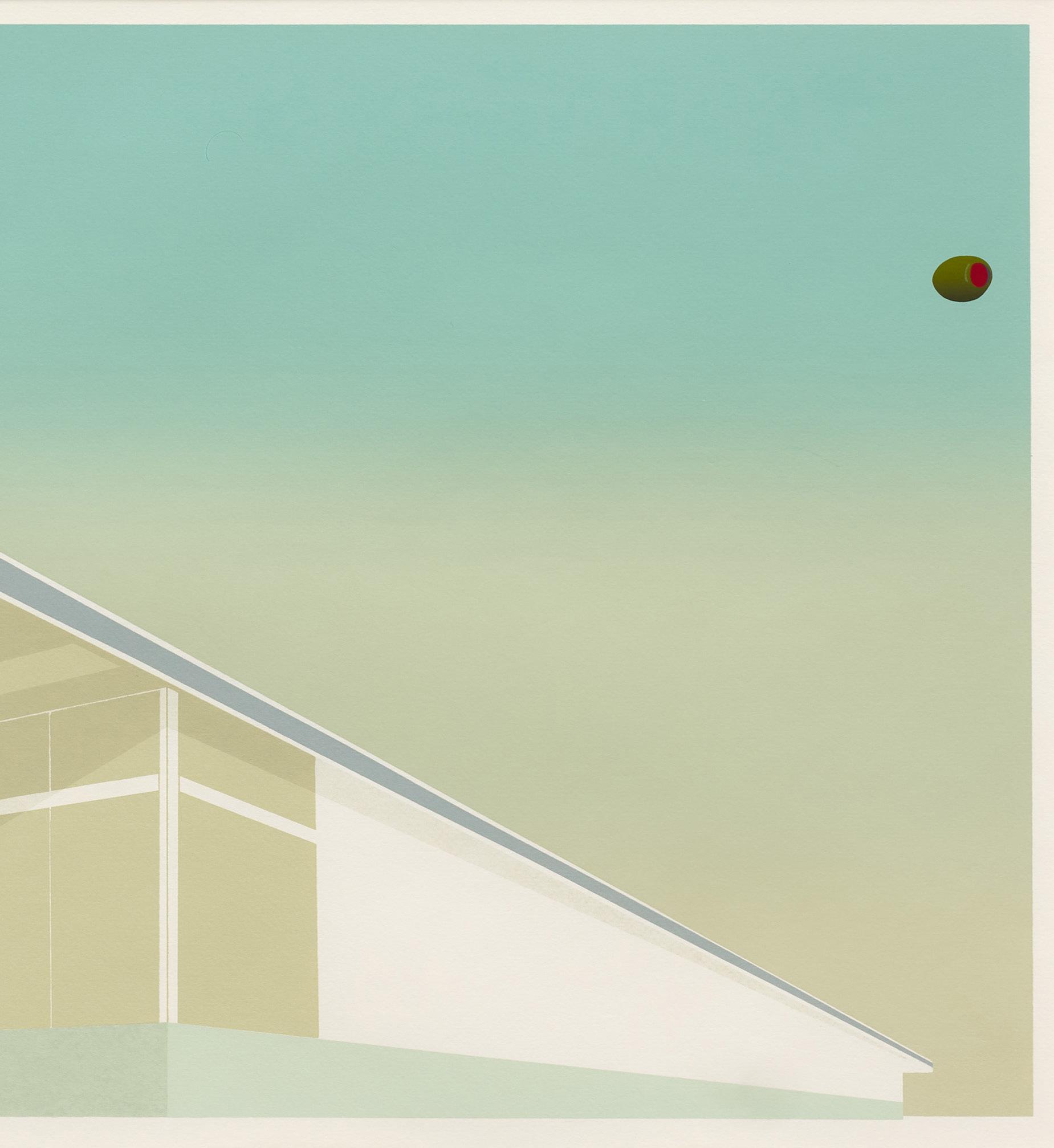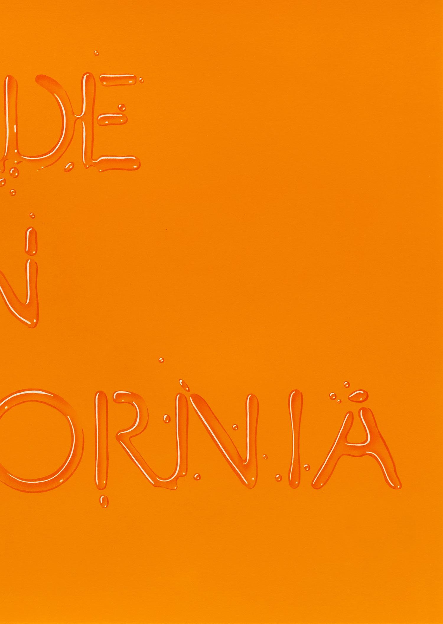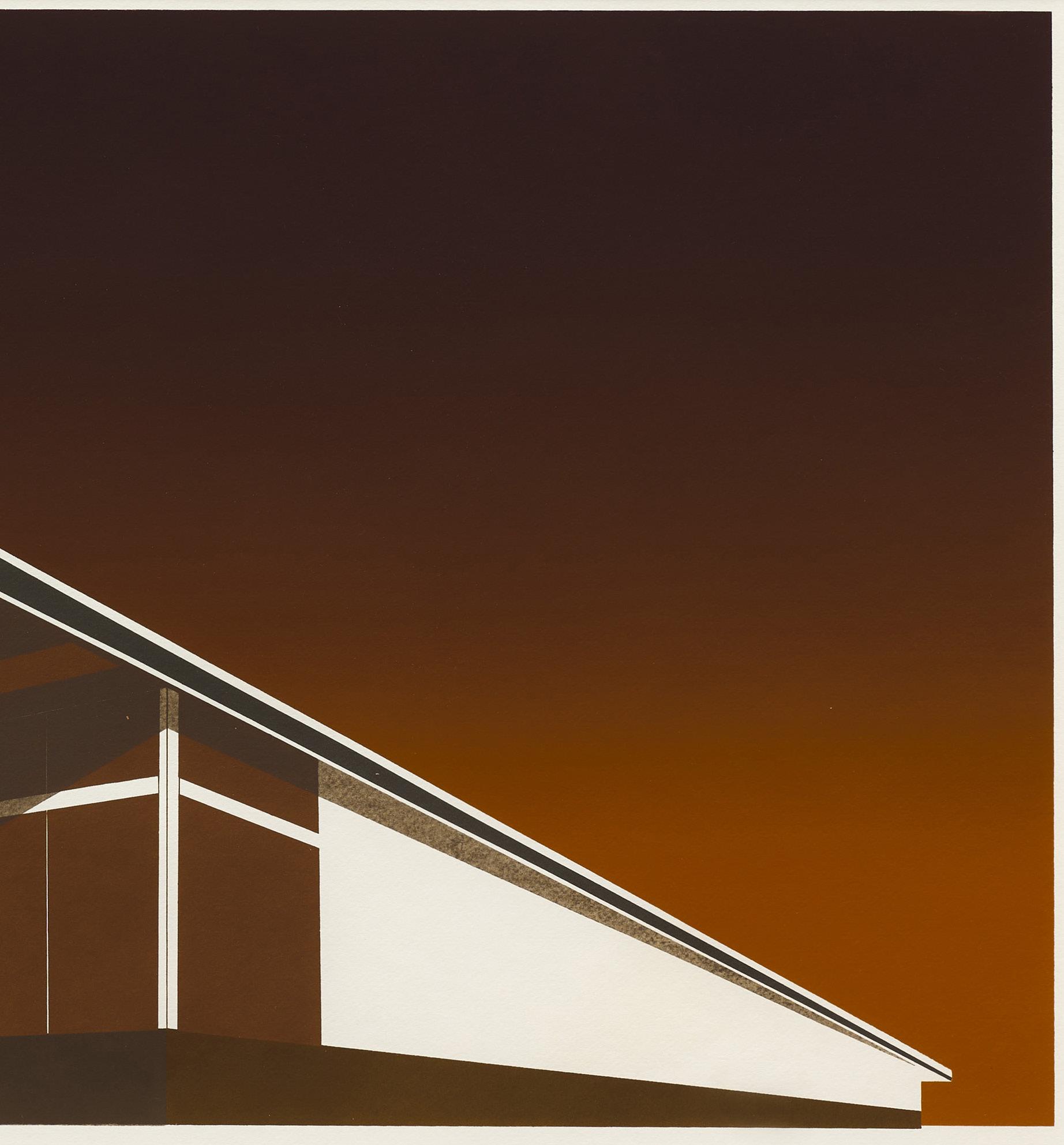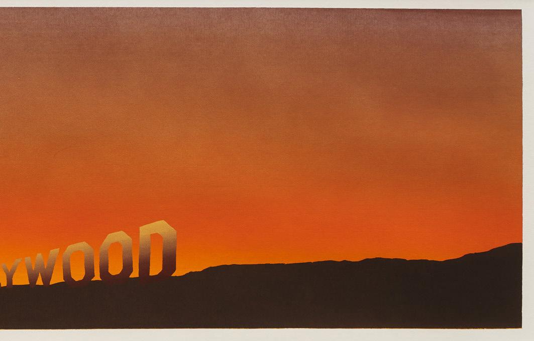The artist’s 1968 Hollywood screenprint presents the landmark in a wide-lens landscape format, influenced by the panoramic movie screen and Ruscha’s experience driving west to Los Angeles from his native Oklahoma. The background’s fading sunset references Ruscha’s identification of California with what he describes as “space, sunrises, and sunsets.” Ruscha employs false perspective to emphasize the sign’s cresting letters, as the sign is actually nestled within the mountain.