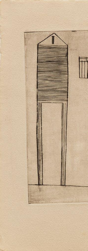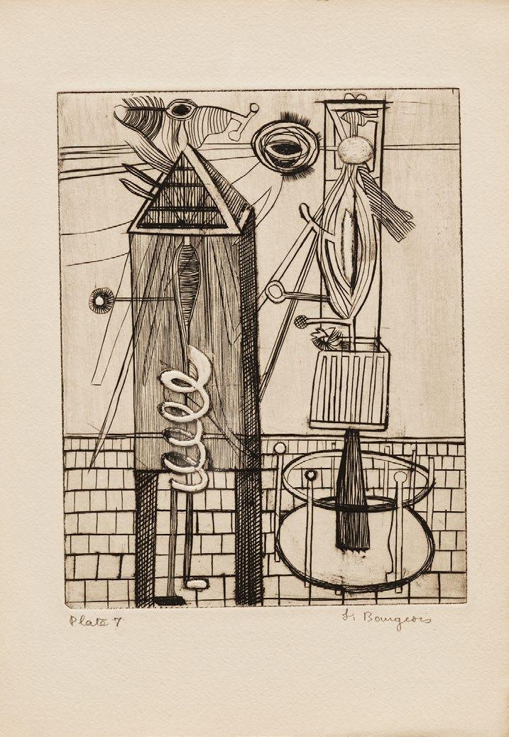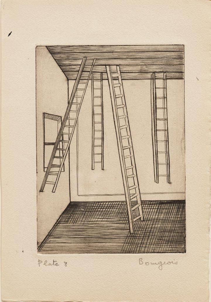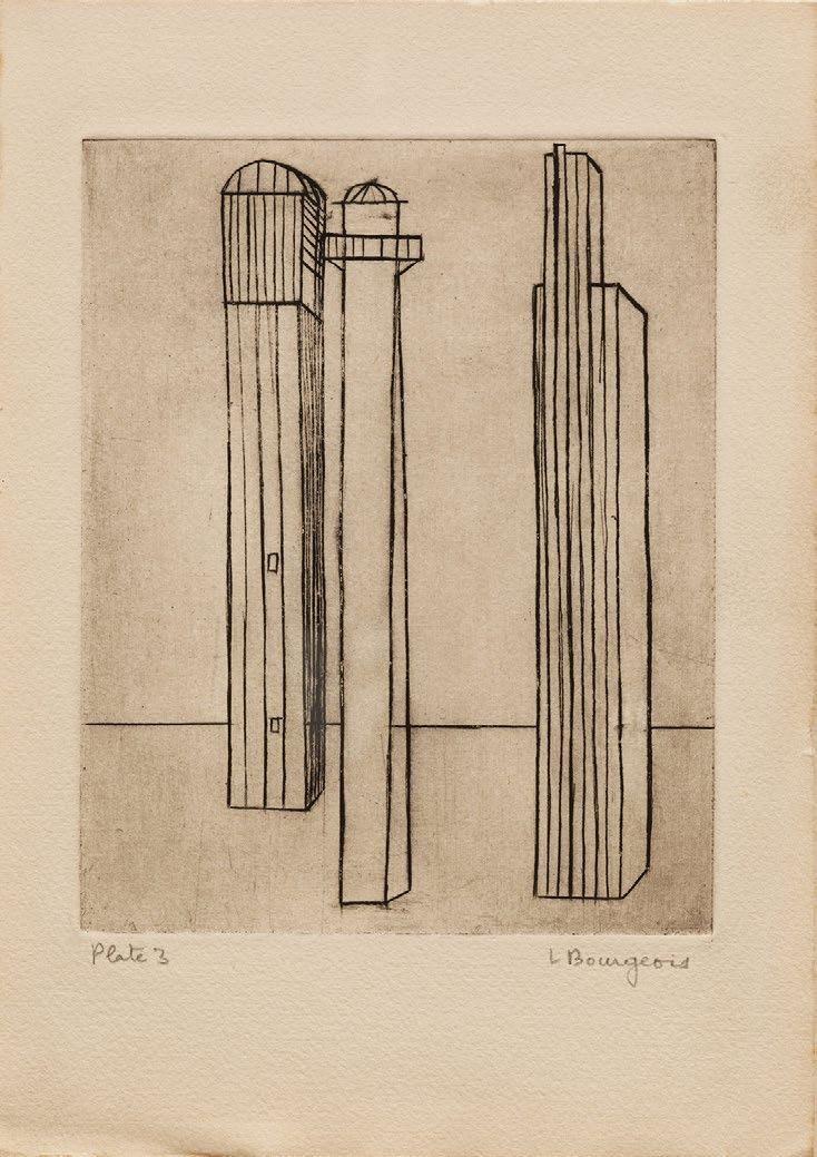 The tall, narrow structures that populate the portfolio’s nine engravings exhibit the proportions of skyscrapers or human beings, and the vulnerability of amateur carpentry. Opposite each engraving, Bourgeois placed bijoux texts—“tiny tragedies of human frustration” in the words of literary critic Marius Bewley, who wrote the portfolio introduction.