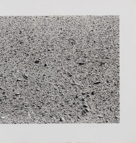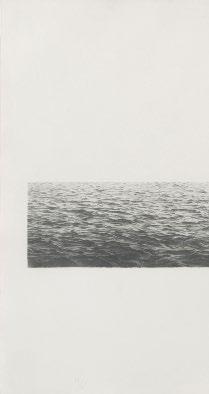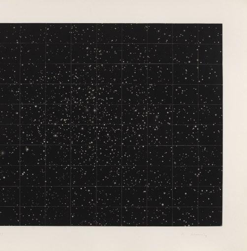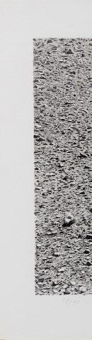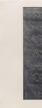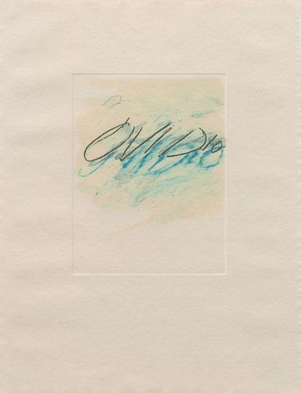 The twisting rows of Untitled II lack the light spontaneity of Twombly’s crayon marks on canvas. The line is distinguished by its irregular, eroded edges. Using open bite, Twombly created valleys and mesas, against whose tiny cliffs ink accumulates, like shadows or dust gathered in a corner. Expectations are further complicated by the decision to ink the plate in white, then roll black over the raised surface areas. Thus, the cliff shadows are more like auroras, and the looping line takes on the erratic grace and splotchiness of a water-damaged ribbon. These reversals—positive/ negative, light/dark, high/low—ripple across the image, producing the unstable, low-contrast shimmer of moonlight on open water. And then, suddenly, it looks like writing again.