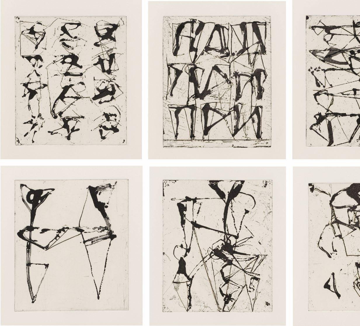 “Hanshan” translates as “Cold Mountain,” a title Marden gave to many works from the late 1980s and early 90s. Less angular in structure, the etchings of Han Shan Exit 1-6 (1992-1993) begin with a leaning tower of looping line and gradually accrue greater weight with territories of biomorphic aquatint.