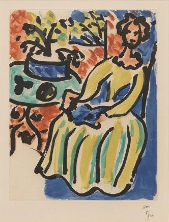 Matisse also tried his hand at color aquatint late in life. Marie-José en robe jaune (1950), loosely based on a painting of that year, shows a woman in a full-length dress, seated by wrought iron table with reading matter open in her lap. But where the painting relies on massed areas of opaque color, the print is carried along through swift strokes of black line, within which blue, red and yellow are puddled. Like Diebenkorn, he offers a master class in balance, deflection, disruption, and the pleasures of vision.