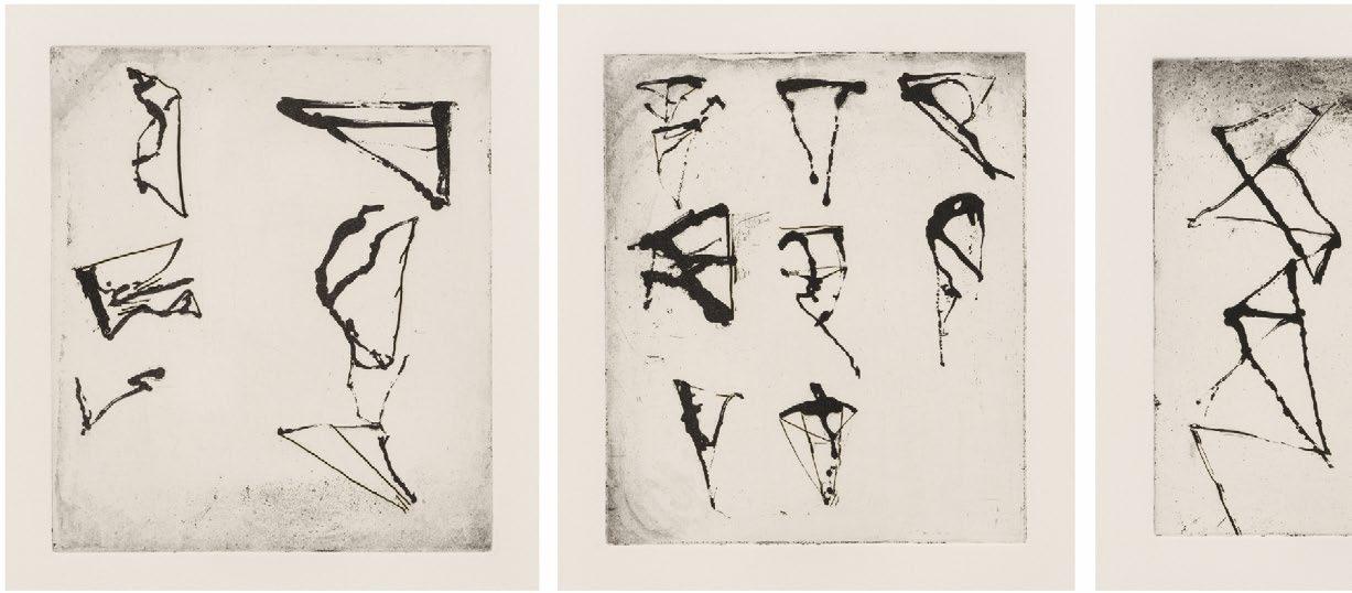For the Etchings to Rexroth, Marden drew on the copper plate using twigs dipped in a sugar-lift solution (after his drawing, the plate would be coated with an acid-resist, then put in warm water where the sugar solution lifts up, exposing the plate below). The result is a semi-controlled line of fitful character, blobby in some places, wiry in others. Linked diagonals, small and large, combine with dribbles and the occasional curve into loose units—sometimes one to a page, sometimes many, arranged in vertical columns like Chinese poetry.