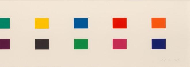 By working in series, Judd could make artworks that were both restricted in their parts and open-ended in their possibilities. Their shared rules and permutations are self-explanatory. In a commanding set of woodcuts from 1988—often hung in a stack formation that echoes his sculptures—all ten prints consist of a rectangle surrounded by a margin. In half the prints, the inner rectangle is inked; in the other half, it is the surrounding margin. Cut channels may bisect or trisect the inked block, either vertically or horizontally. Editions were printed in red, black and ultramarine blue.