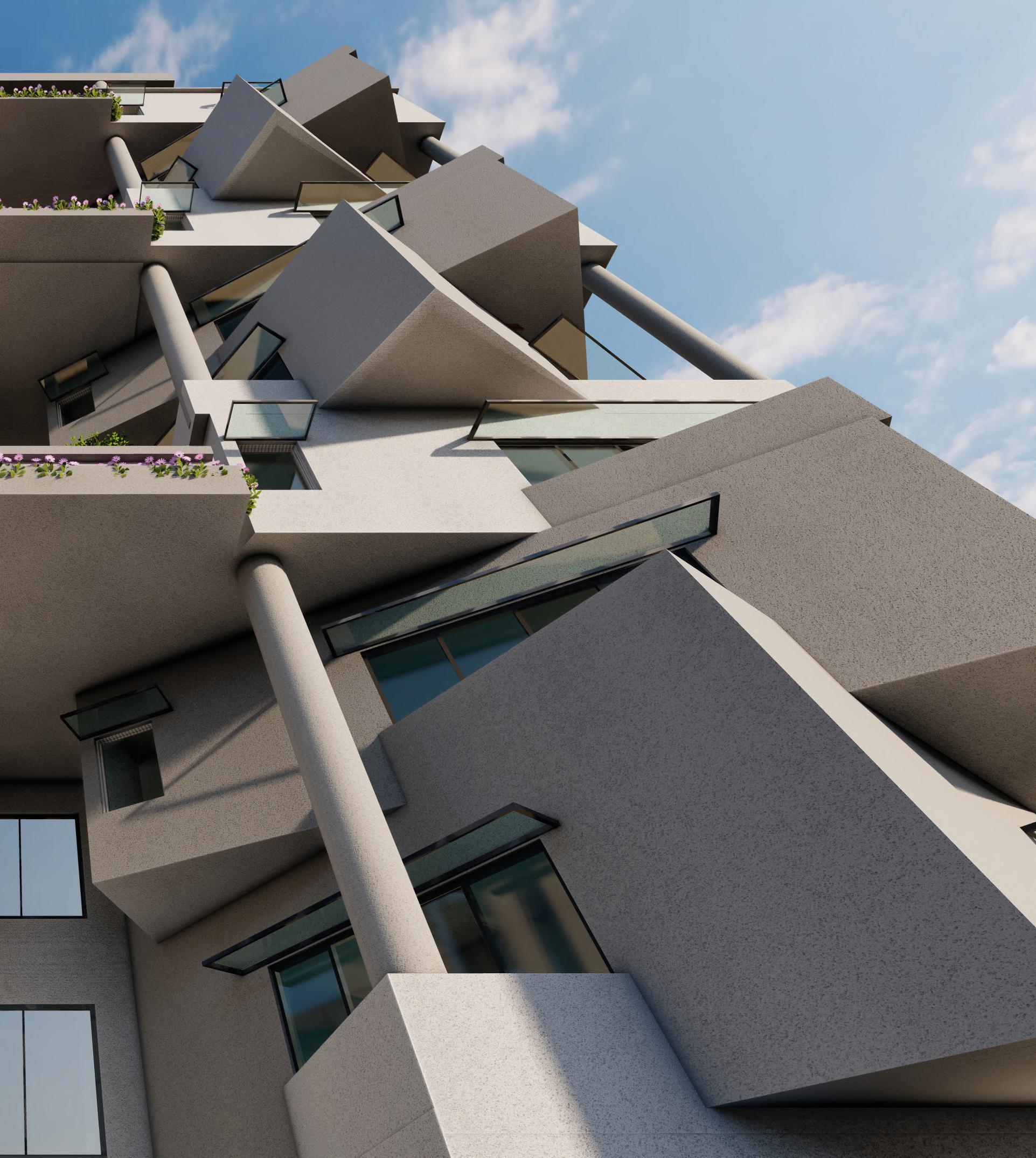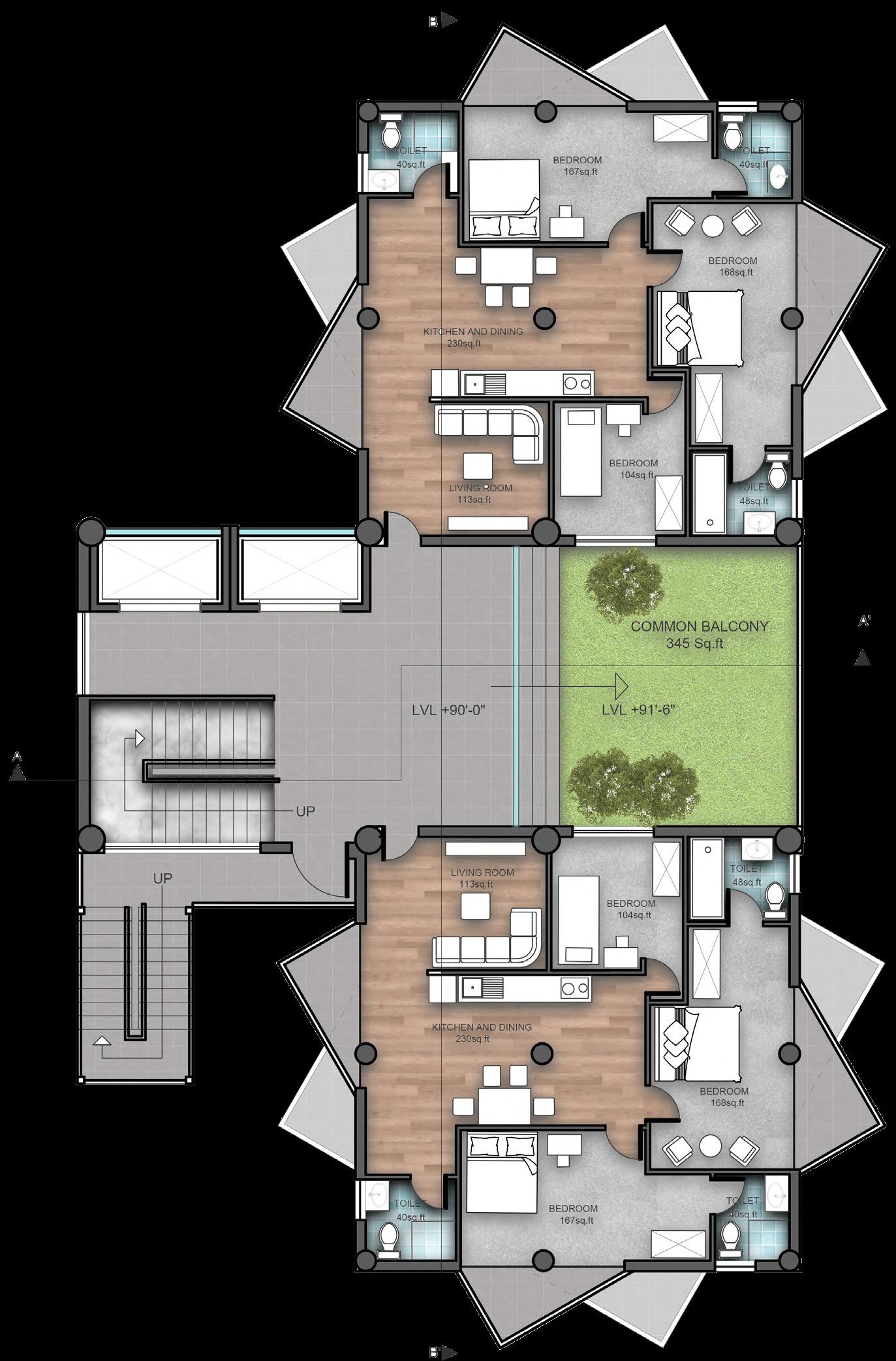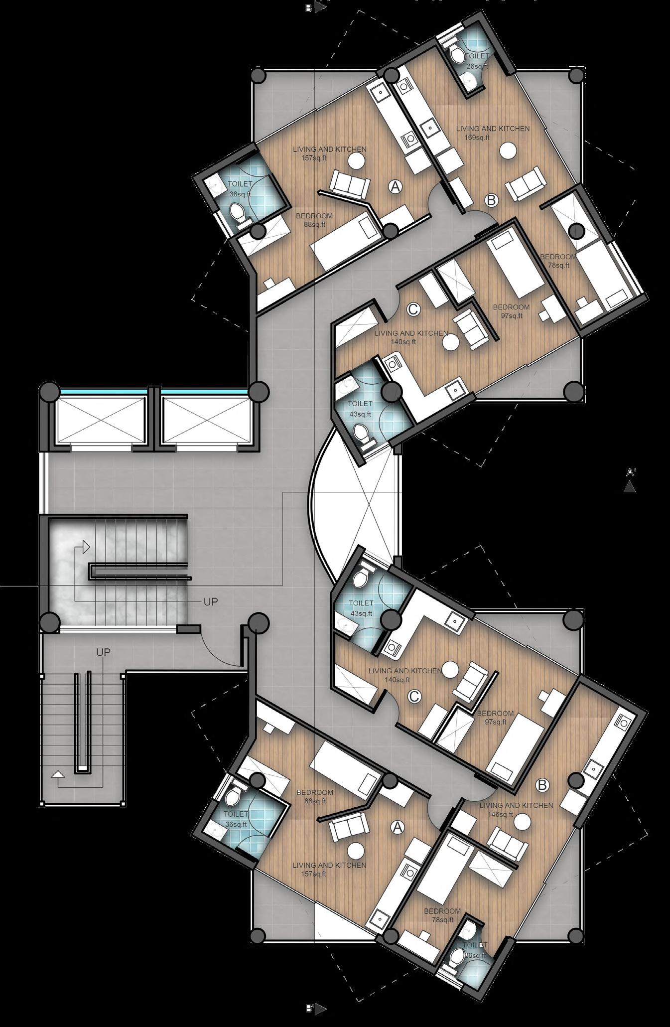 So, personal requirements were met when each building floors were rotated at ‘30º’ creating a abstract volume while providing each apartment units with double heighted personal balconies and triple heighted communal balconies as well.