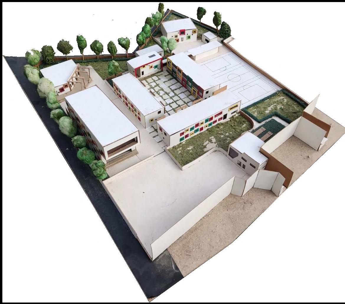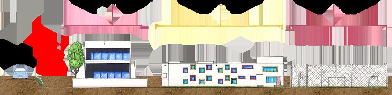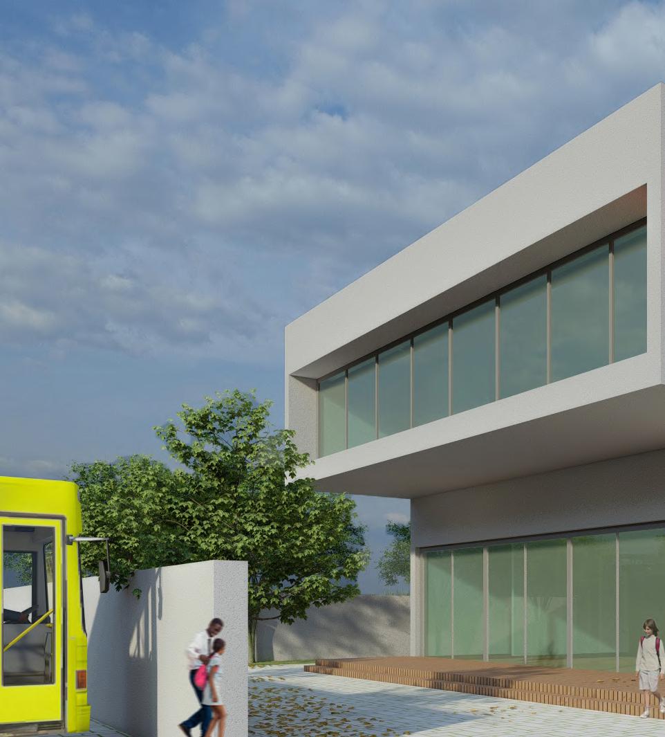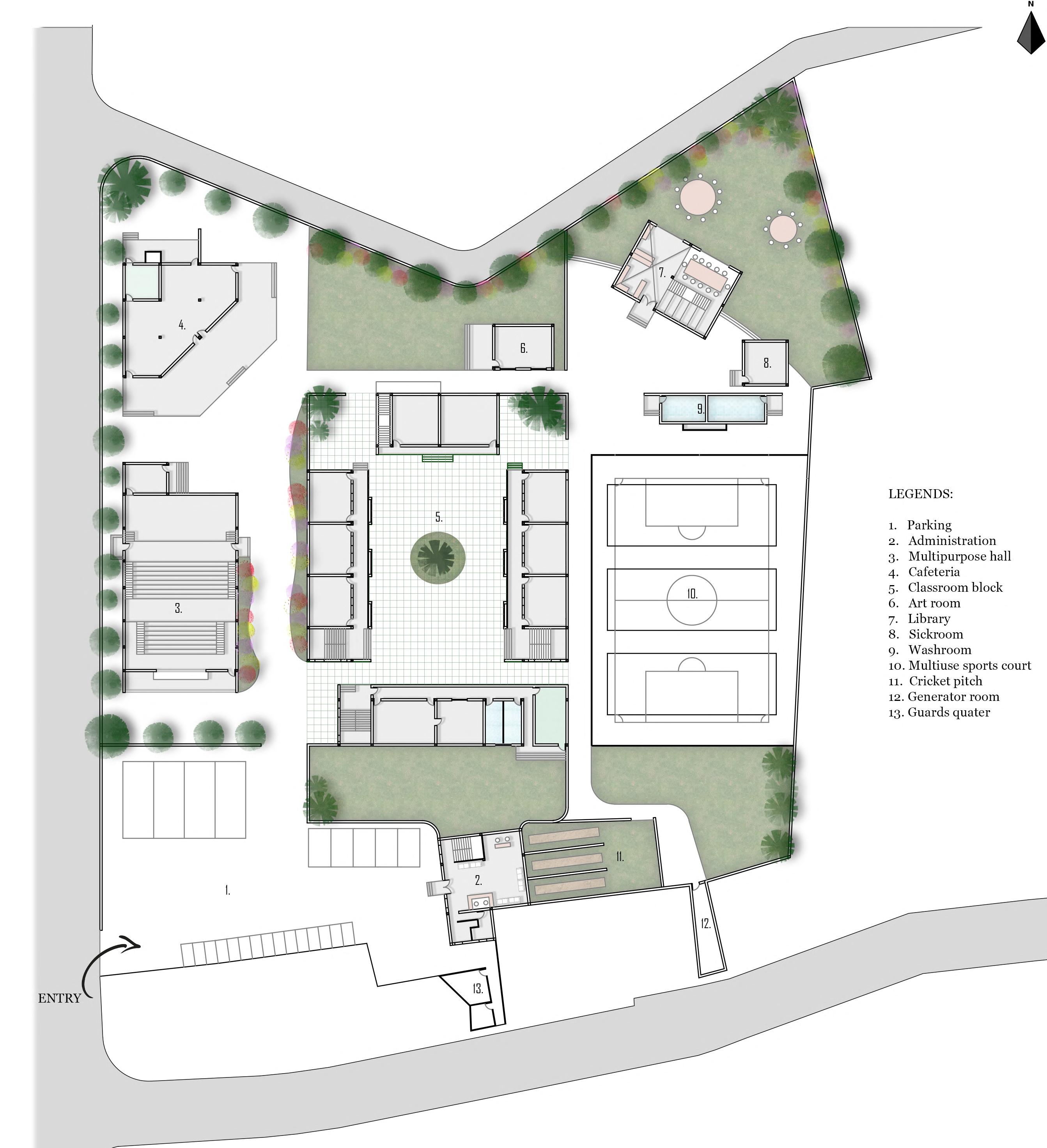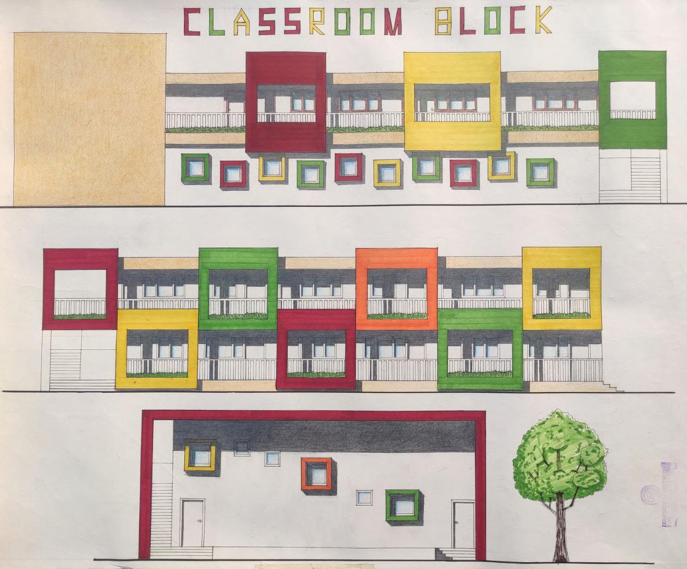Classroom Block placed centrally on site for maximum sunlight to enter directly into the classrooms and surrounding noises from the roads being absorbed by the buffer-zone, an appropriate study atmosphere is maintained.