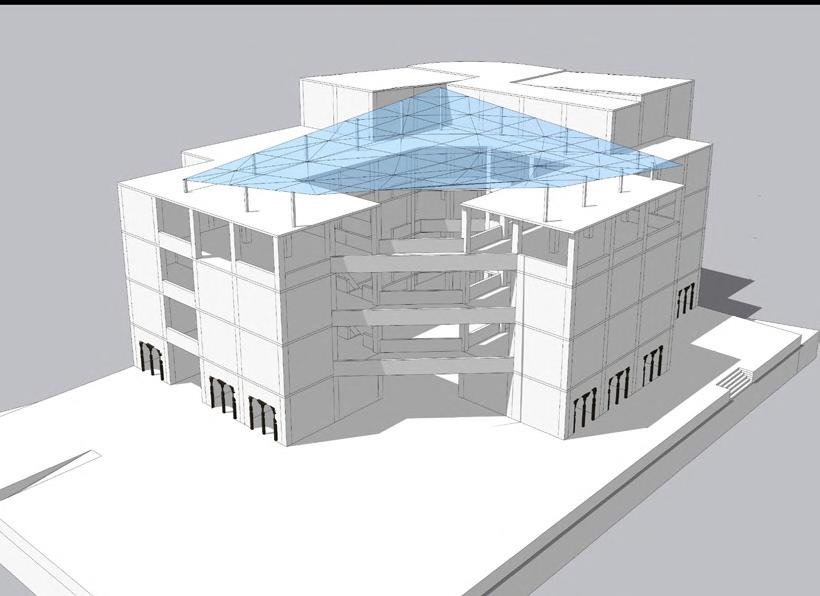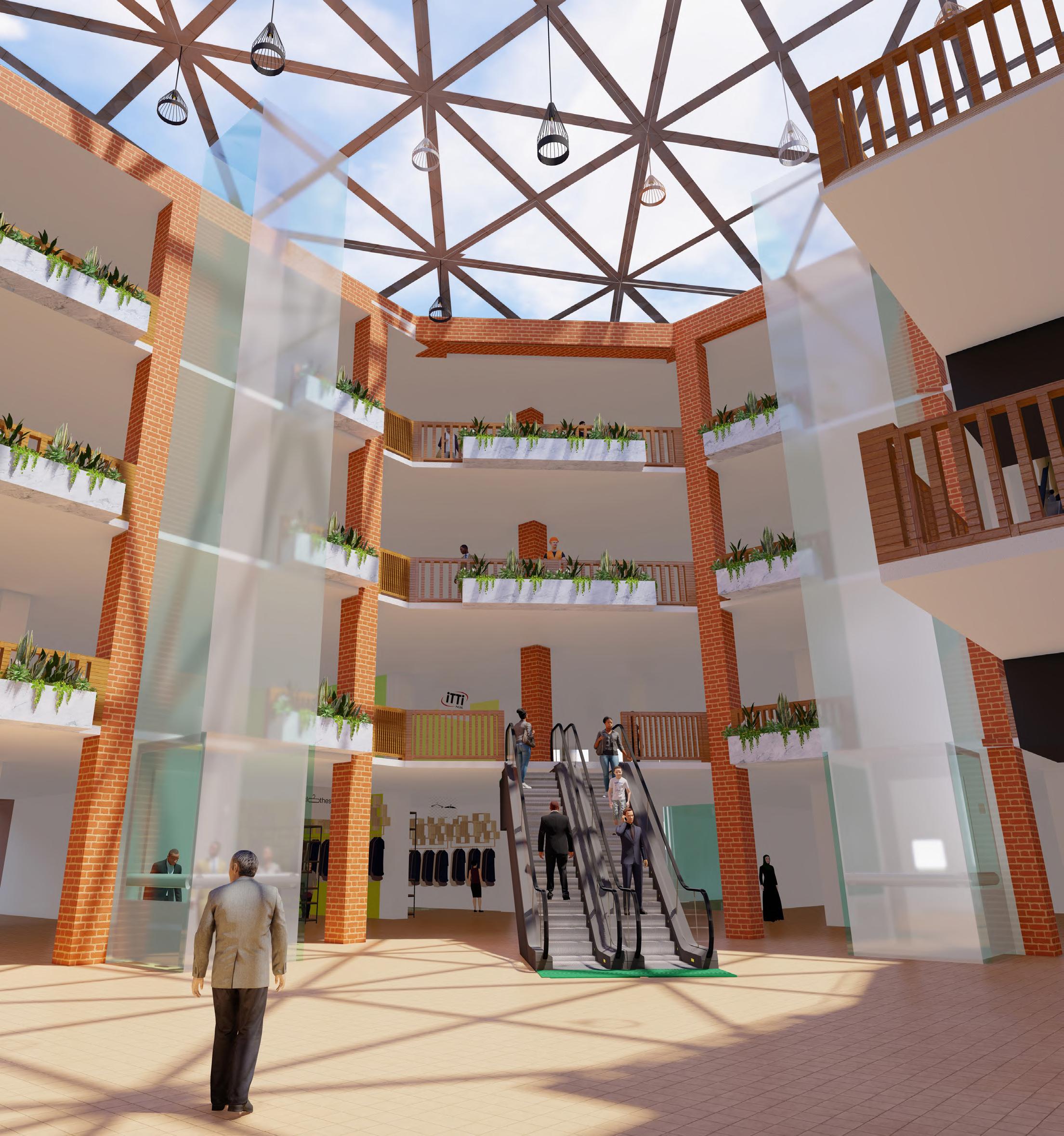 Roof of the atrium is covered witth glassed hyperbolic-parboloid structure which ends the structure well and puts a feeling of wonder among the users and people passing by the complex.