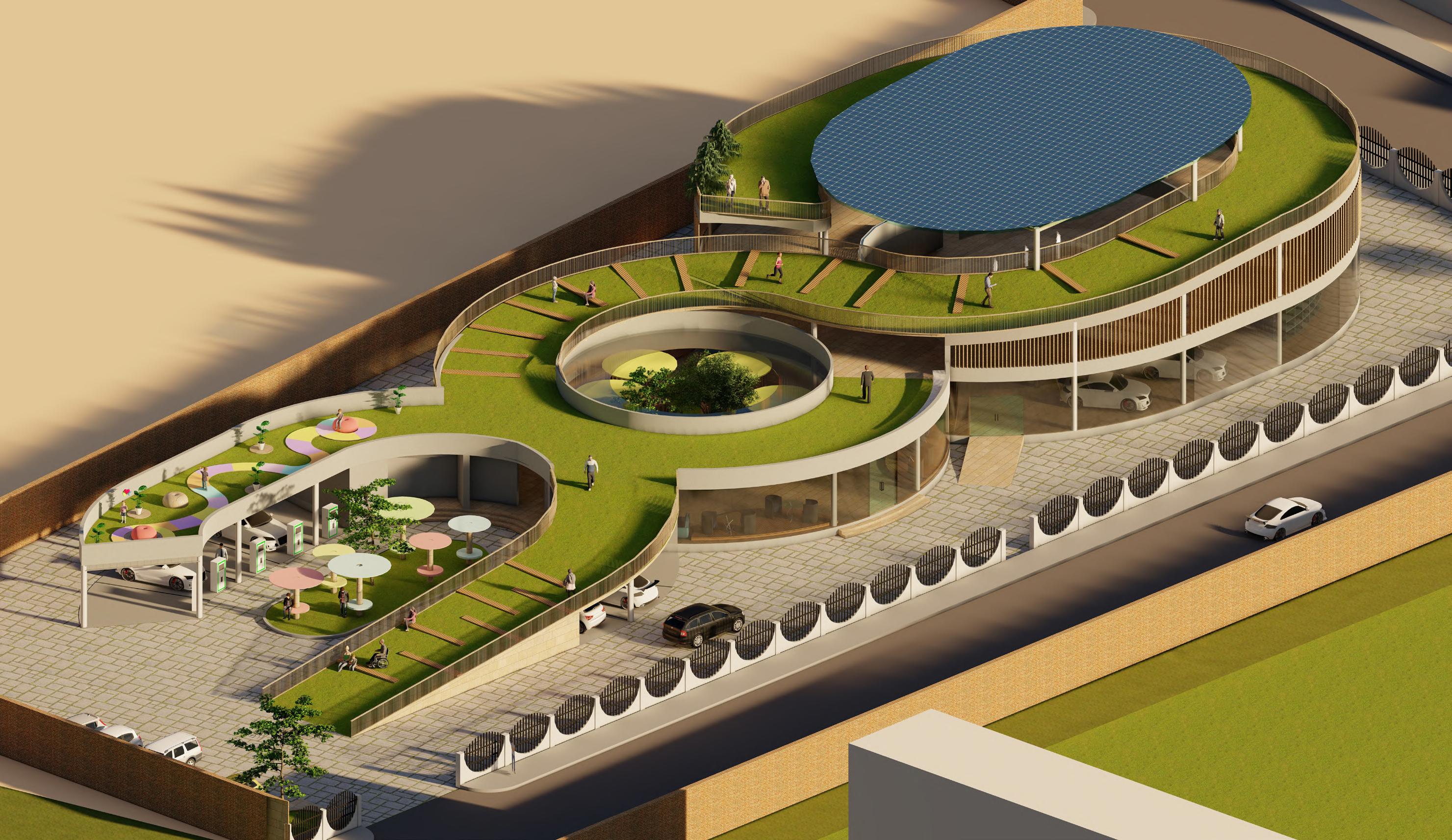 There arent many charging stations in Nepal and people donot seem to know about their locations . So, the initial idea was to develop a structure different from site suroundings for easiness to distinguish the charging station.With all the surronding buildings being in linear form the first step was to go with a curvilinear form. To promote electrical vehicles and use of renewable sources of energy, the form was developed from infinity shape which represents infinite energy(electricity) one can get from the source(sun).
