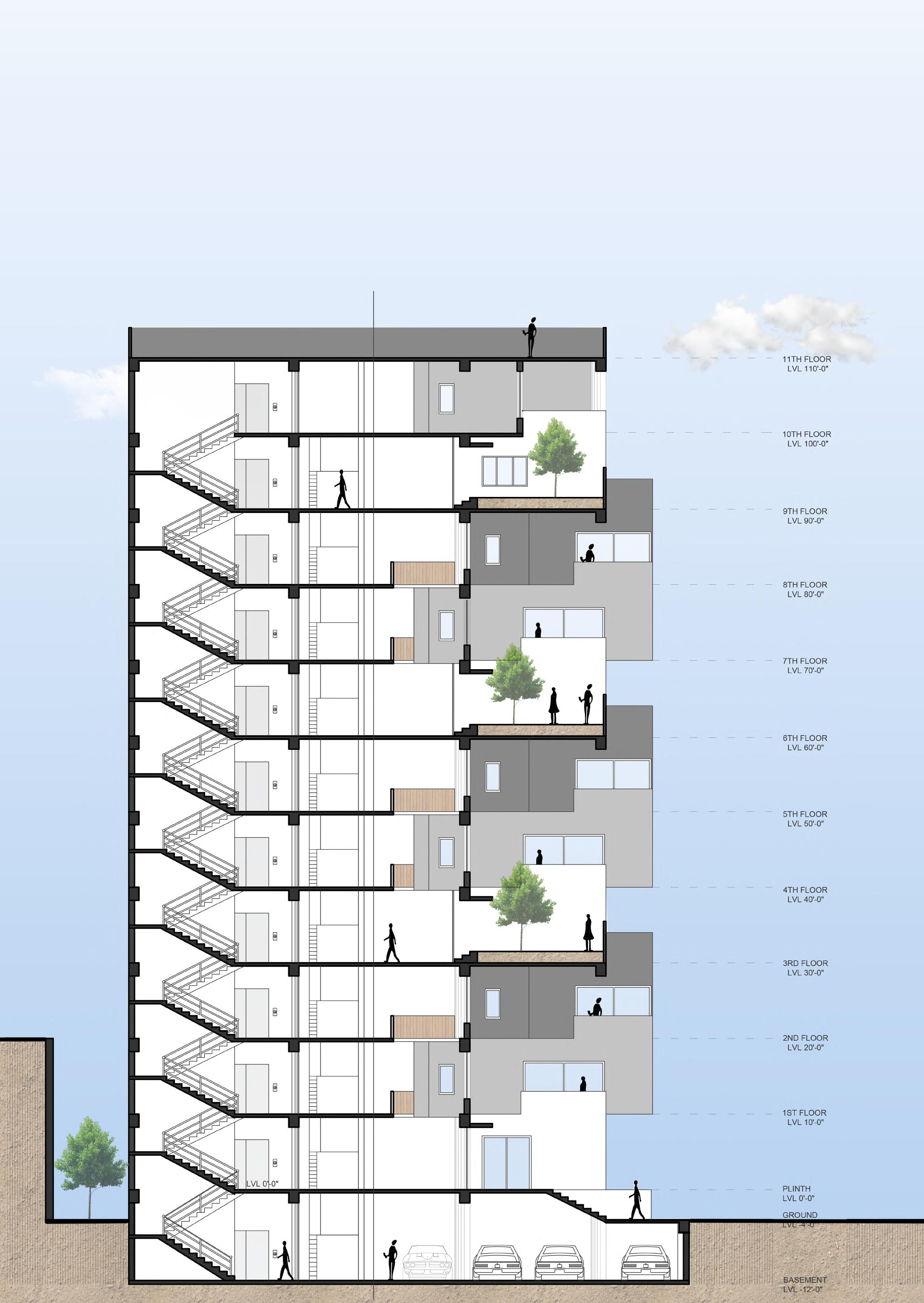 Apartment unit is just a fractional part of building and people to live in a such a limited space can be challenging so the initial idea for the design was to create multiple open spaces throughout the building for interaction among the community.