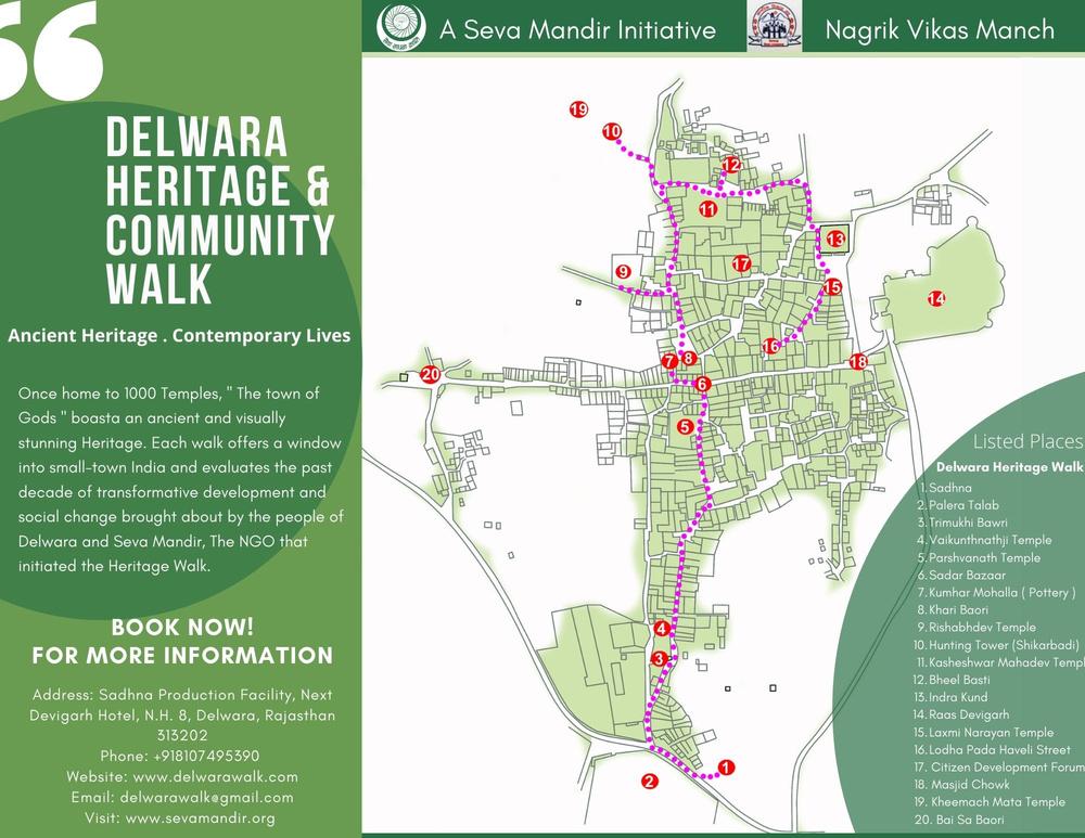 A Seva Mandir volunteer selected 20 local youths from the Youth Resource Centre and trained them in spoken English and local history so that they could conduct heritage walks around the town After intense screening, six young people were finally selected as guides. On 30 August 2013 the Delwara Heritage and Community Walk was launched by the Minister of Culture Visitors are charged Rs 300 for the walk, which covers 16 points in the village. 90% of the money collected through these walks goes to the guides, while 10% is deposited in the youth fund