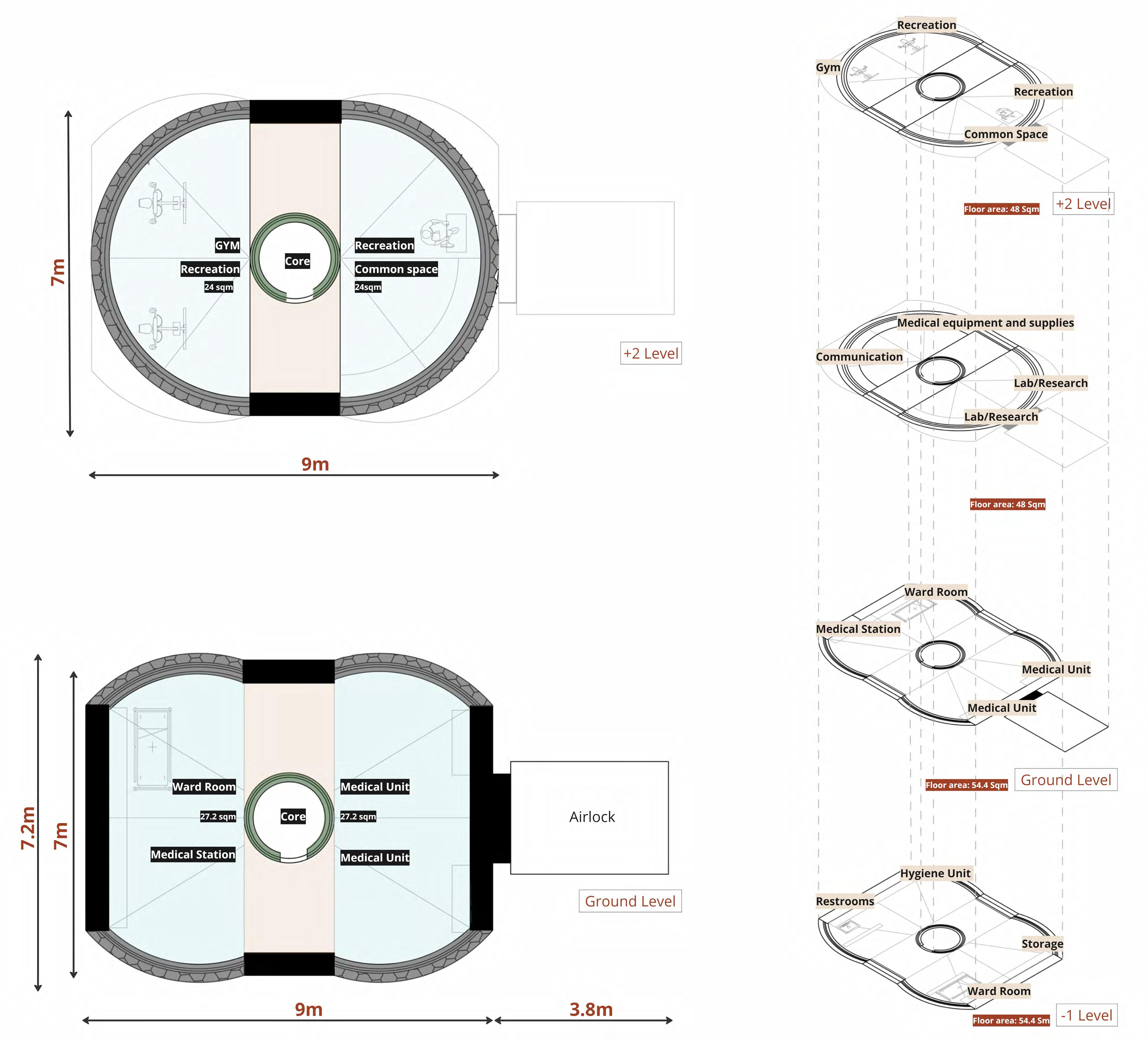 These modules are separated into two primary sections. One is a living module for the crew to use when they are not completing an EVA or work. Secondly, we have the working module where the team is able to conduct research and perform their tasks of finding innovative research on the planet.
