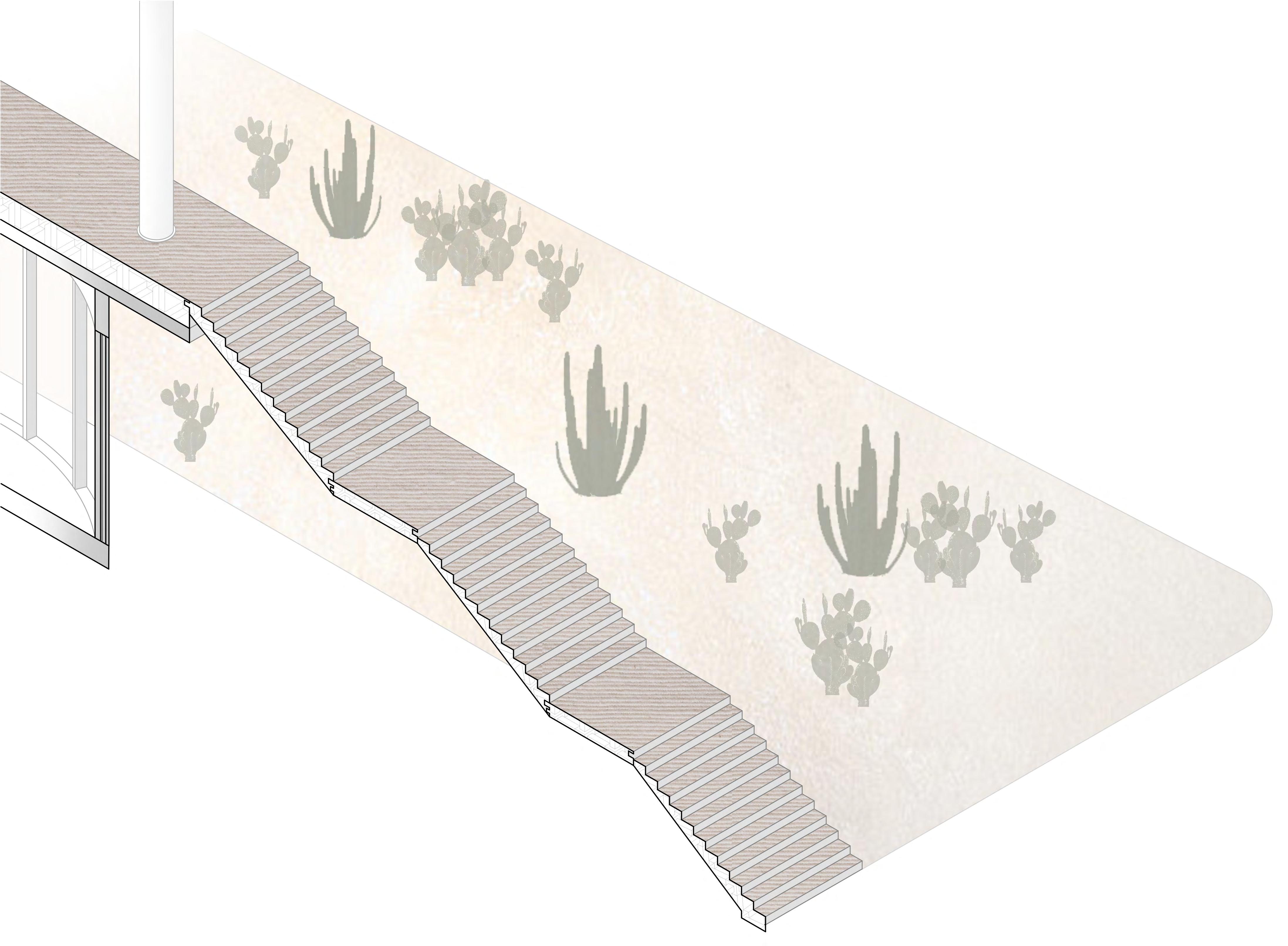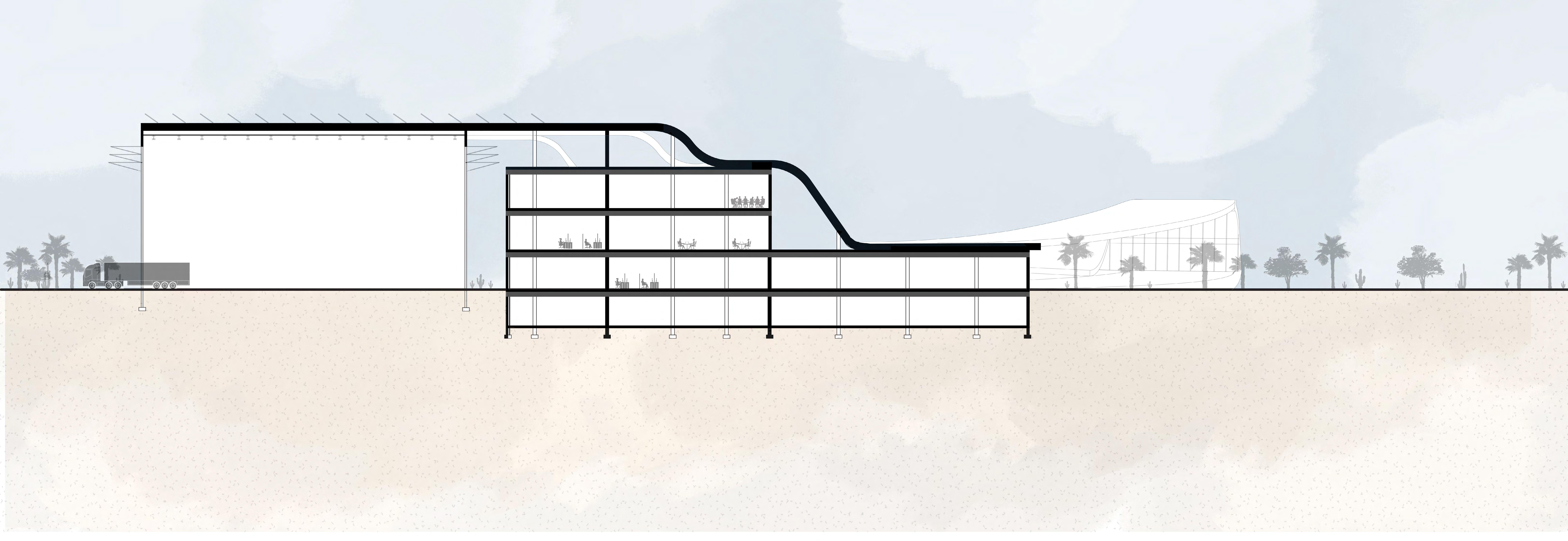 The greenhouse is adjacent to a small solar field and date farm to the west, as well as housing to the east. The original site layout includes the date farm, which is run by ASU employees as far as we could tell, and since we were already required to dedicate pieces of the lot to food production and park space, we thought integrating a renovation of the farm with our plan would be an excellent opportunity for research and community engagement while providing an interesting local business to wander around and buy from. The aforementioned solar field next to it gives the site an extra power boost from the ground. In the future, this piece could easily be modified to be more parking with solar panels on top as a shade structure.