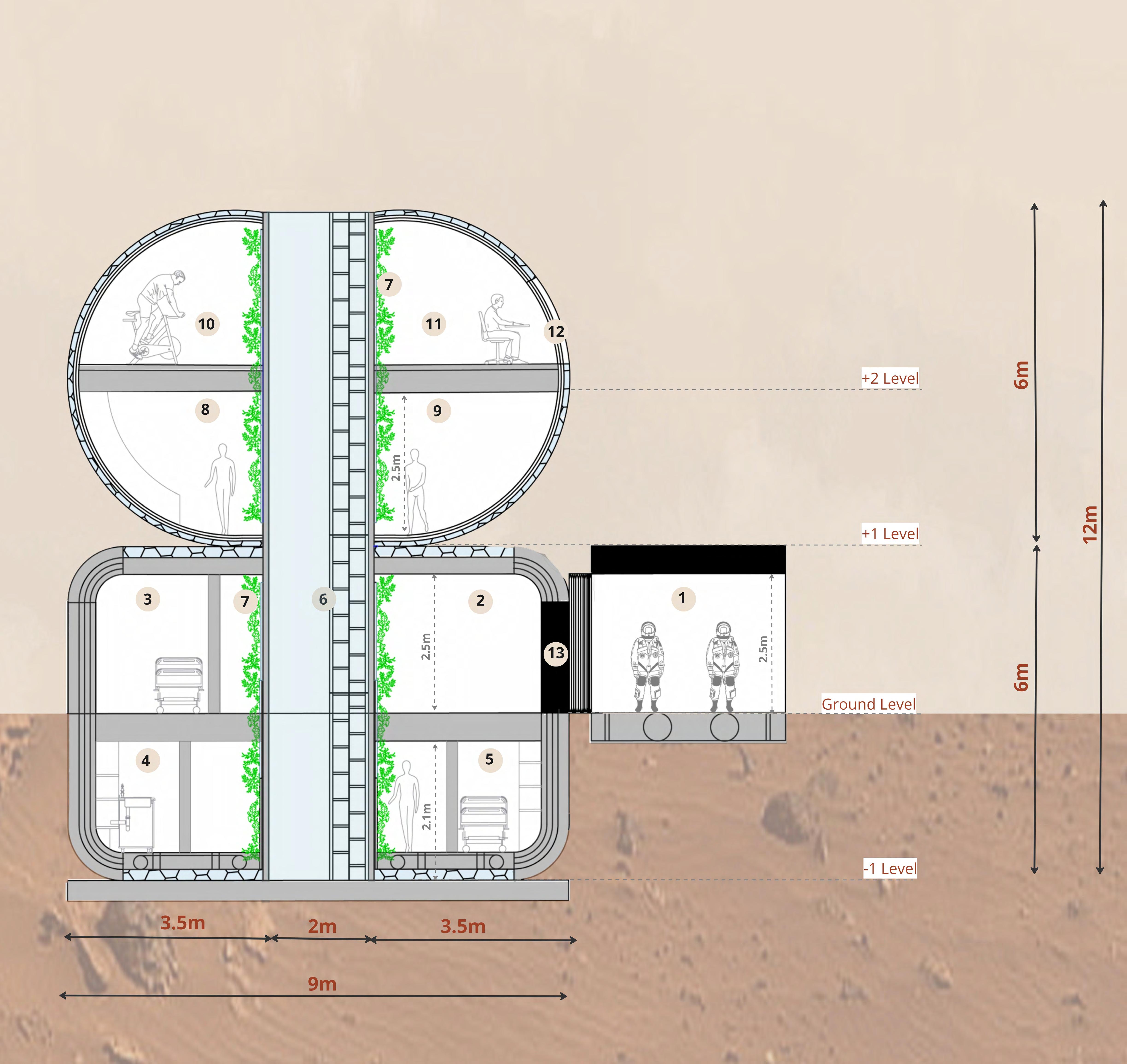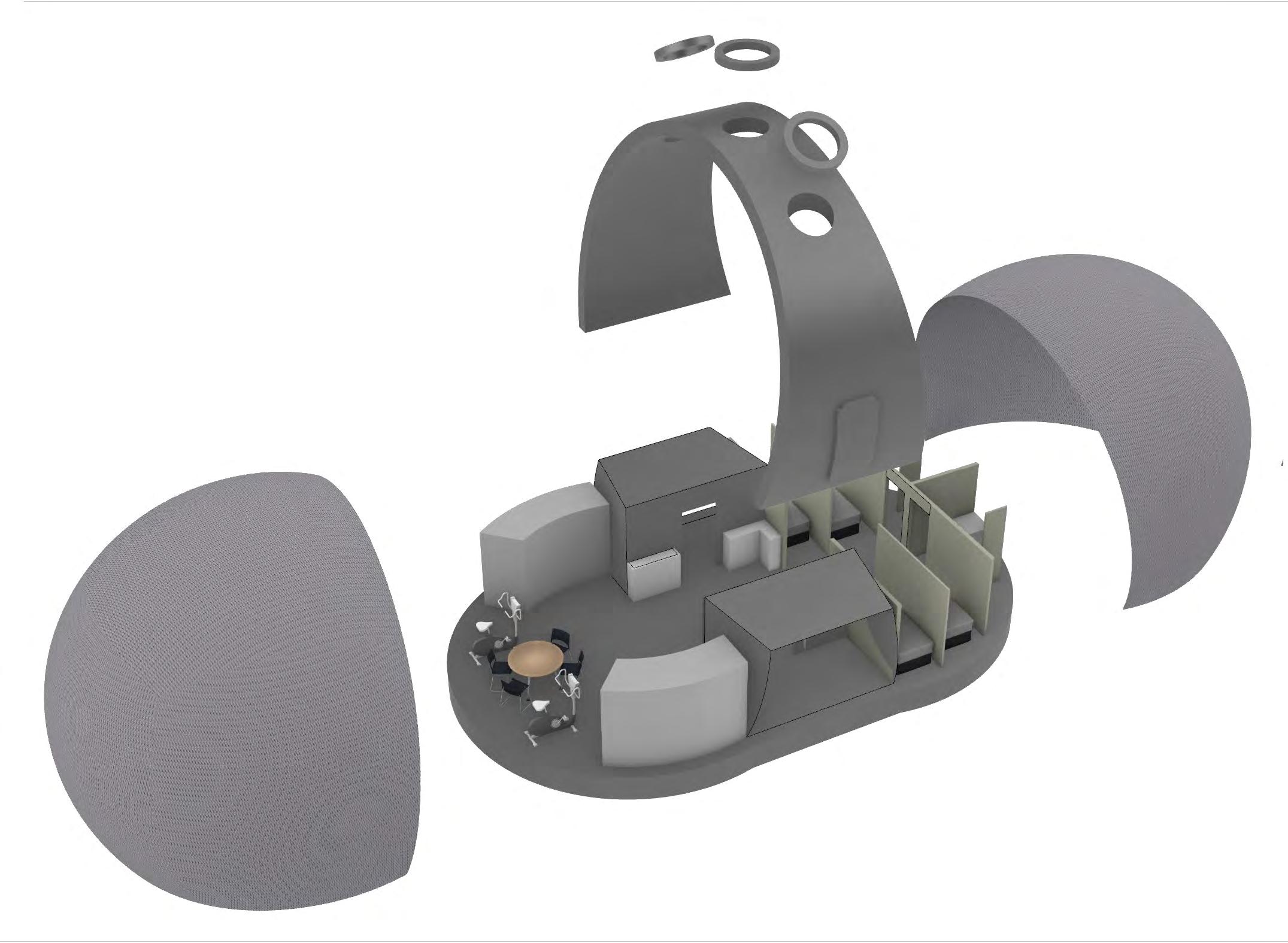 one, an aforementioned exploration yard, is “Venus,” and as a hot planet is unshaded and left mostly sand. It’s a larger patch than the one between the hangars and is a little more accessible to viewers since it’s out in the open. Stuck onto it is little “Mercury,” which will show off the gantry printing system used to make all the 3D printed offices around the site, and perhaps some pieces of the roof. The final circle is “Earth,” the only planet with life, hence the fact that it houses people. The housing structure is circular to fit with this celestial theme and to call back to the futuristic atmosphere of the site as a whole.