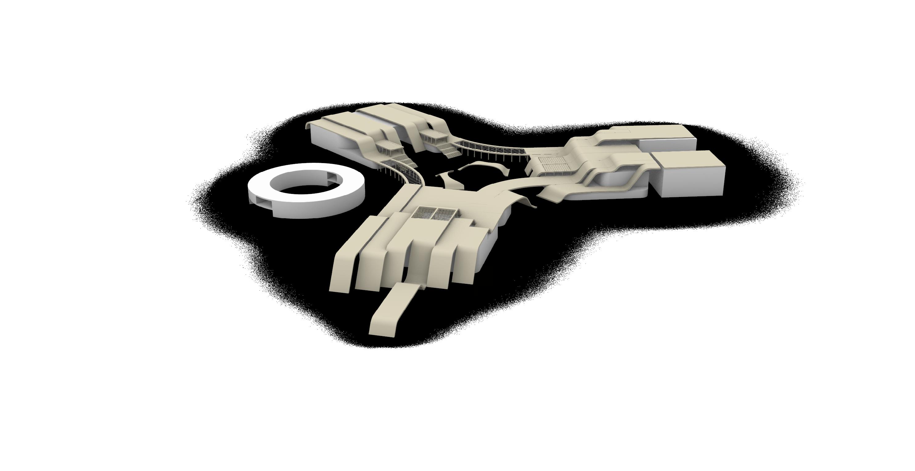 The main three building programs comprise the first half of our layout and consist of the labs, greenhouses, and museum. They are oriented along the site’s cardinal directions and placed for both internal efficiency and external integration with what already exists around the plot.