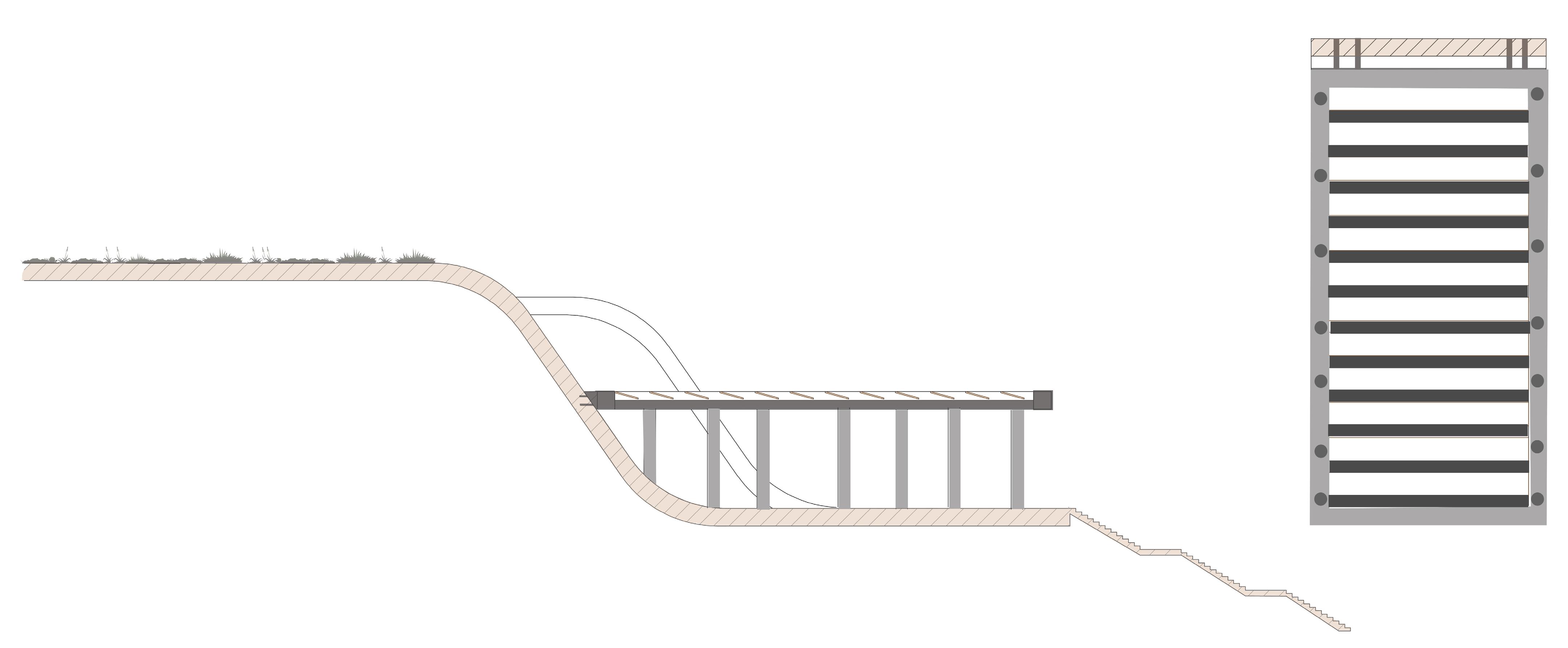 as it’s by default the sunniest area of the site; the roof bends up and down in ribbons to let natural light in, and solar panels decorate accessible trellises to catch even more sunshine. With these characteristics it shades the area while utilizing the light. Staircases connect the ground level to an upper floor where people can sit and observe the space campus as a whole.