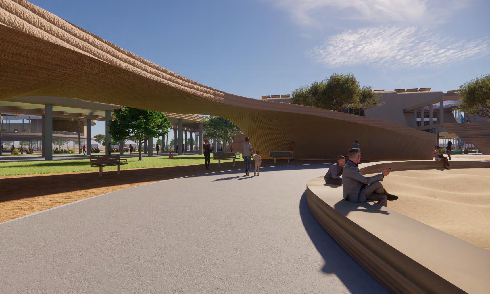 Overall, the main themes we wanted to push in this project are connectivity, progress, and sensitivity to the surroundings. The three largest and most central buildings are connected to each other with their ribbony roof structures, which span outward from the center focal point, like rays, or even roots, bending up and down to join the ground and sky together. The connecting trellises have solar panels to again both protect people and produce power. The landscaping mimics the structures, in its rows of plants and benches, and the planet-gardens, and keeps the plant life simple and native while still novel. And, of course, with how high-tech 3D printing is right now, we believe the overarching progressive nature is clear.