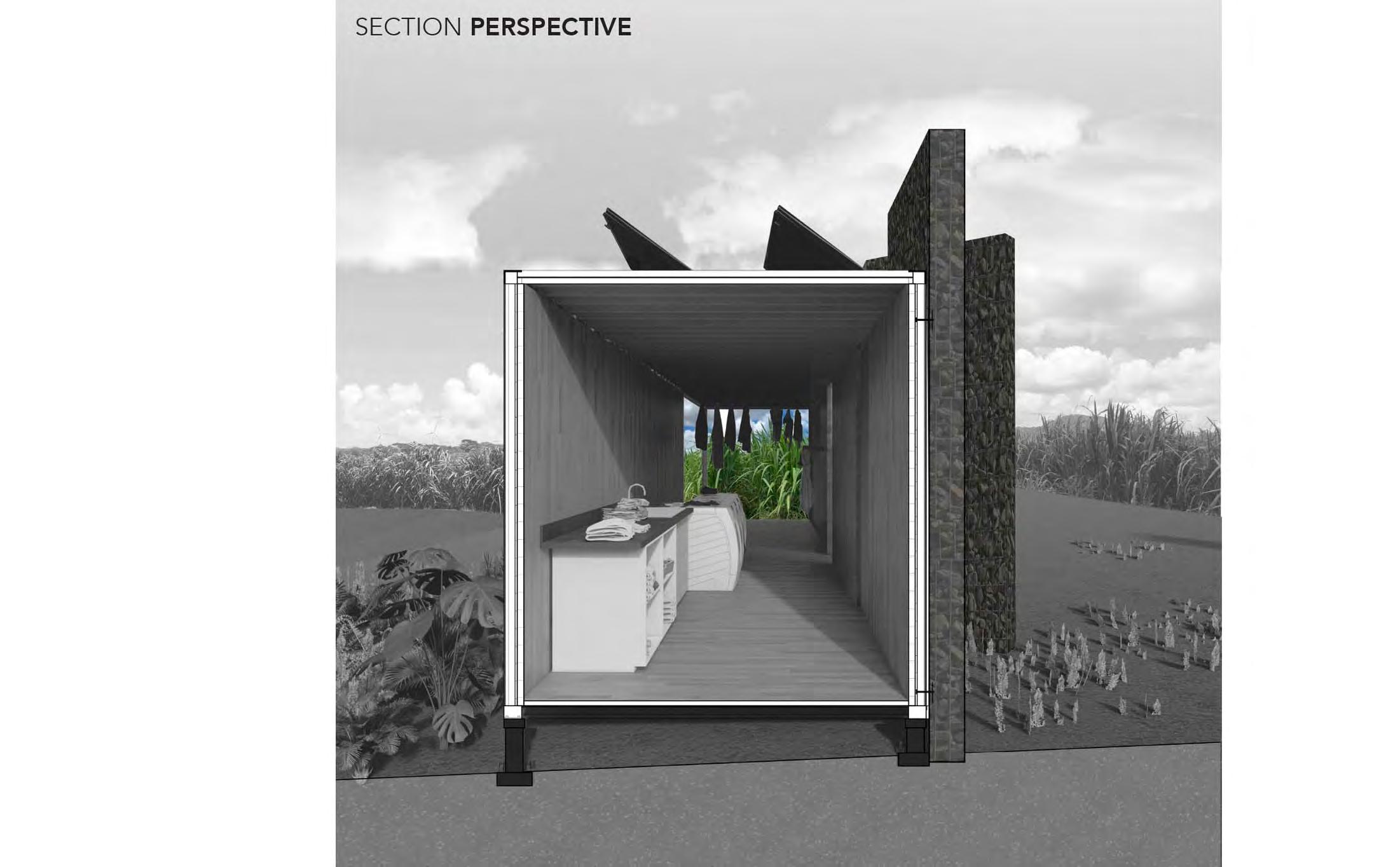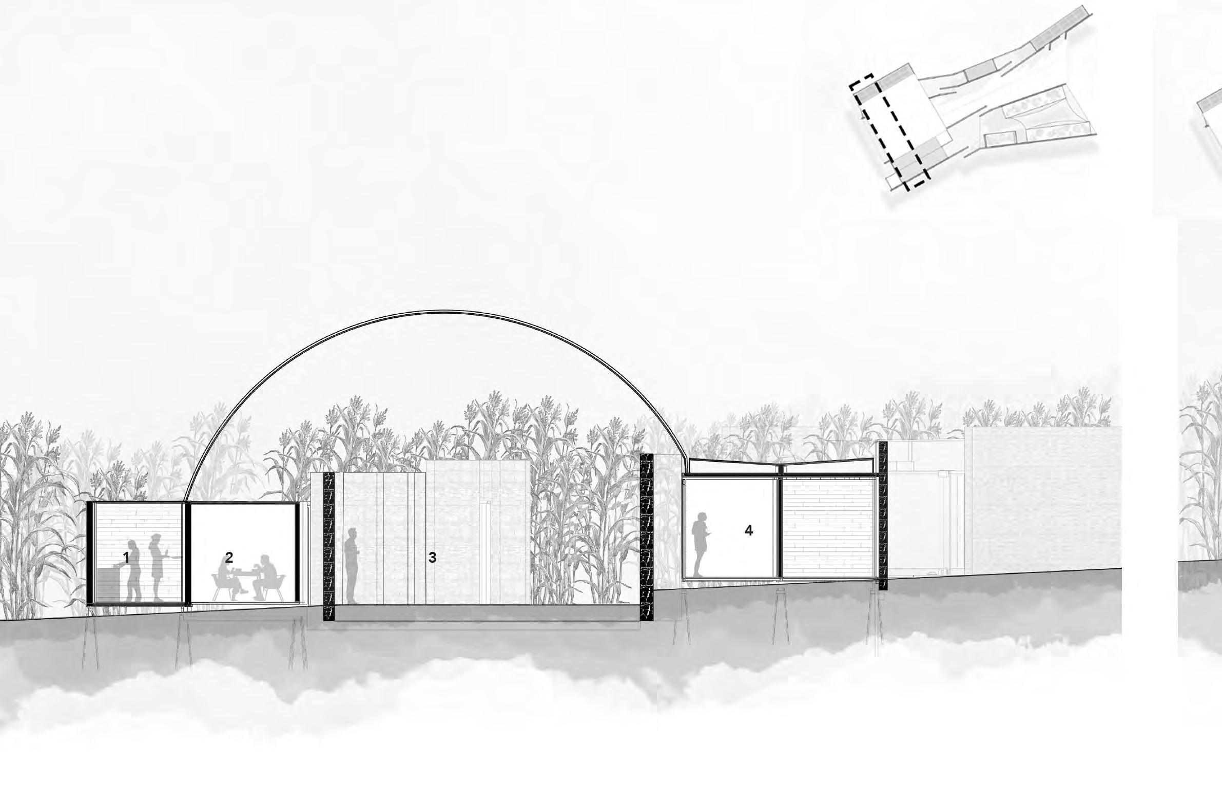 The arched canopy over the vessels defines a versatile event space between them, framing the ocean view in one direction, and the view of the sugar cane and the farm in the other. This section illustrates the variou activities that can happen simultaneously across the kitchen, dining, event, and conference room spaces. Note the subtle changes in topography and how the vessels respond.