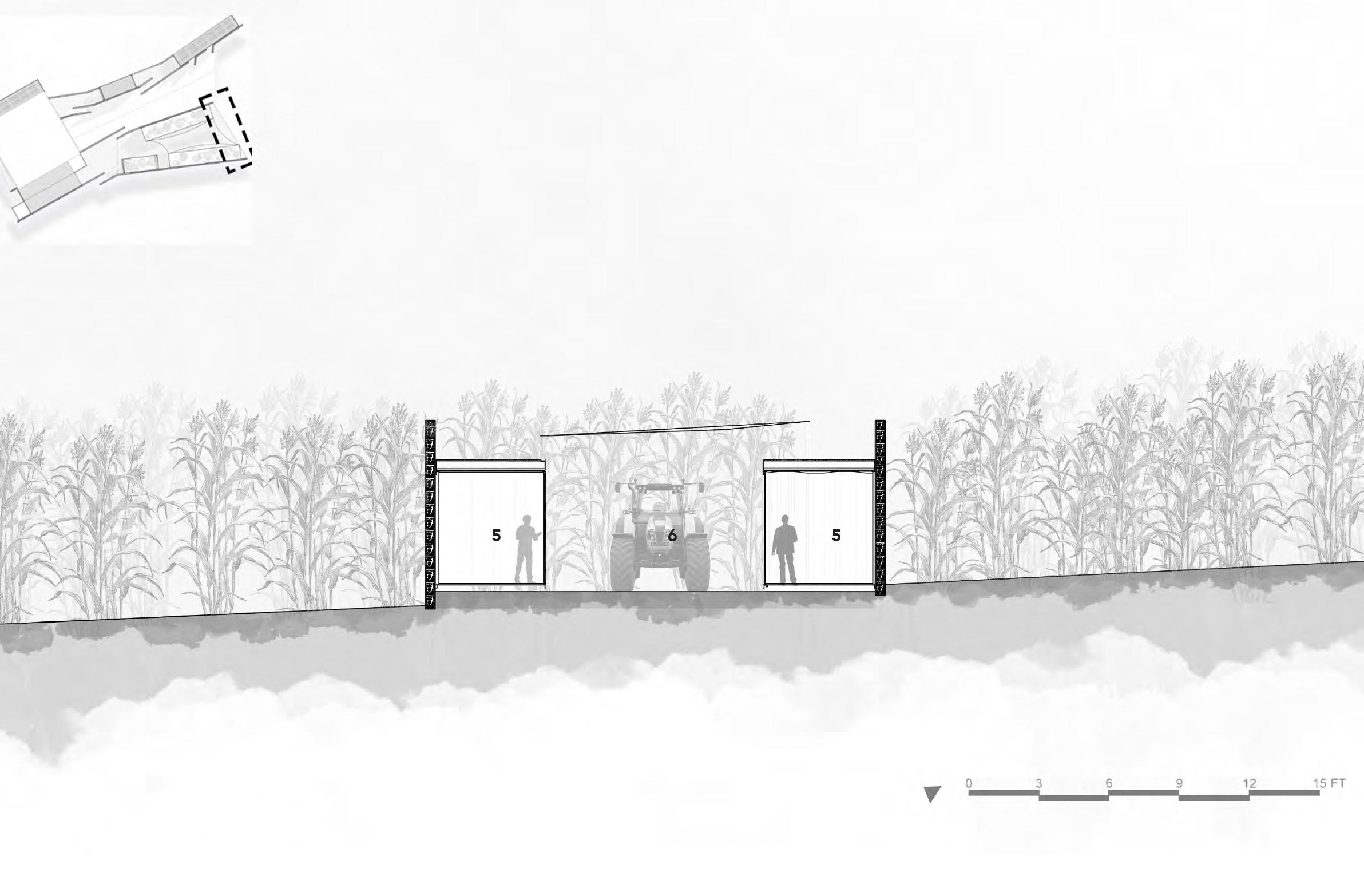 This broken section illustrates through the entire site the different volumes and material components of the buildings. The spaces inside the structures become more visible, and thepersonalities inside the storage spaces, office space, and conference space come alive. Cutlines are in crisp black, showing the relative volume of the walls. Darker lines are materials nearthe cut and lighter lines are materials shown beyond the cut spaces.