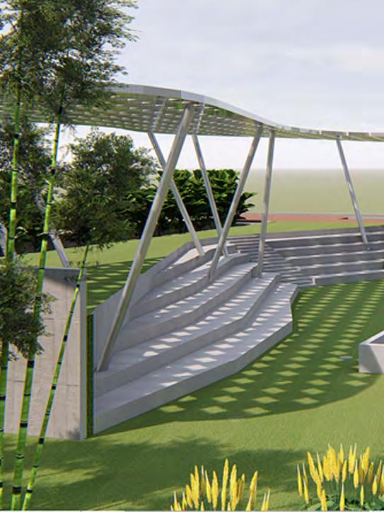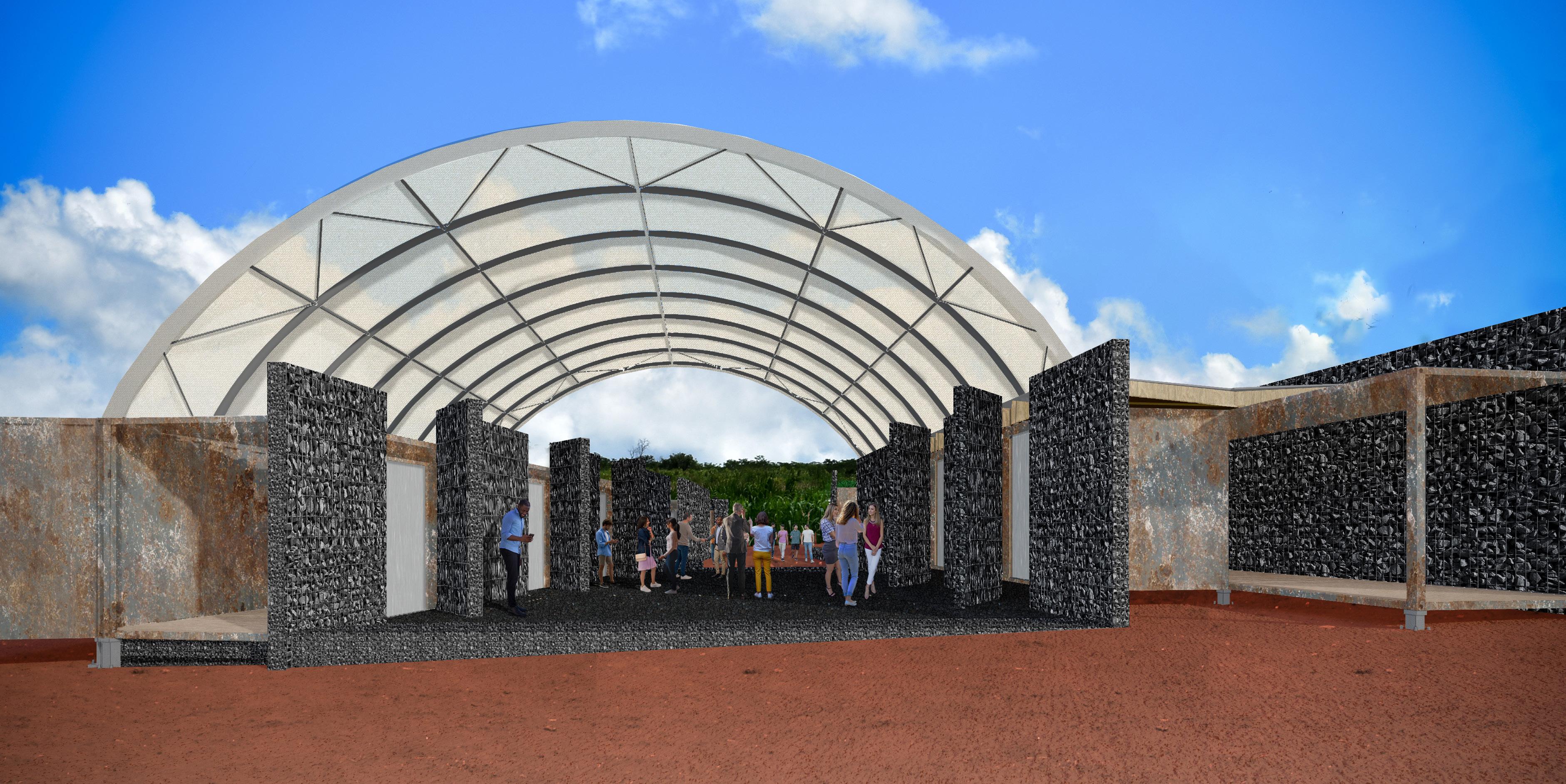 The Onohi, spacial represented in connection to the site. Different components like the Vessel, Gabion wall, canopy, and the Volcanic cinder ground below and how each of them are connected.