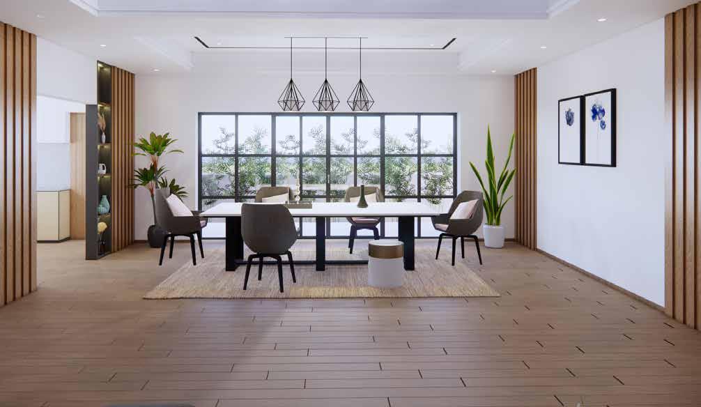 The entry is through a small foyer, which opens into a large living room with combined dinning and leads to an open lawn which is designed to enhance a relaxing sensory experience creating a connection between the interior and exterior.