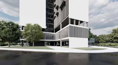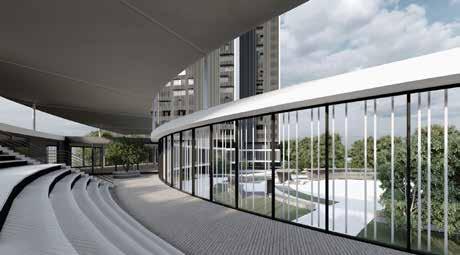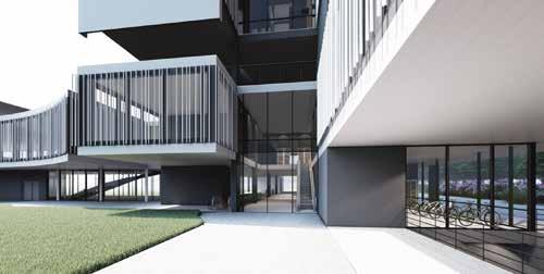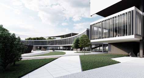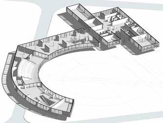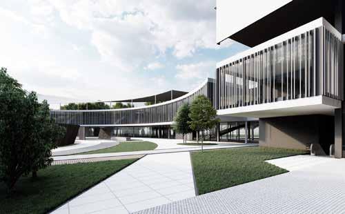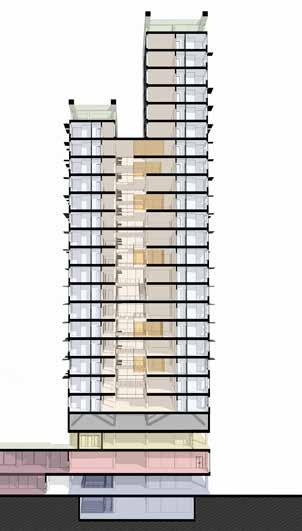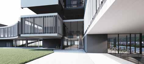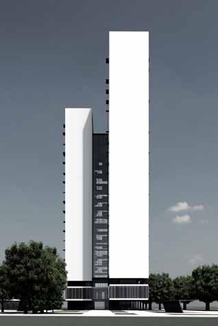There are two main towers consisting of the typical floors, mostly of private and semi-private functions with various types of rooms for the students which are connected by a central atrium with common spaces for students. The tower is connected with the Lancetti station with its underground level. The curved structure consisting of public functions creates a central plaza and also serves as a focal point from the entrance. The lower levels of the towers consist mainly of public functions which is not restricted to just the students but can also be used by the neighbourhood