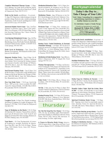 Soul Focused Healing Circle – 7pm-8:30pm (2nd & 4th Tuesdays). Donation $10. Align & Harmonize Chakras of the Body, Mind & Soul. Bridges of Wellness, 1881 N E 26th St., Suite 244, Wilton Manors, Rev. Elizabeth Lucey, 954.348.2652. [tue Geddes extra oncal Dec14]