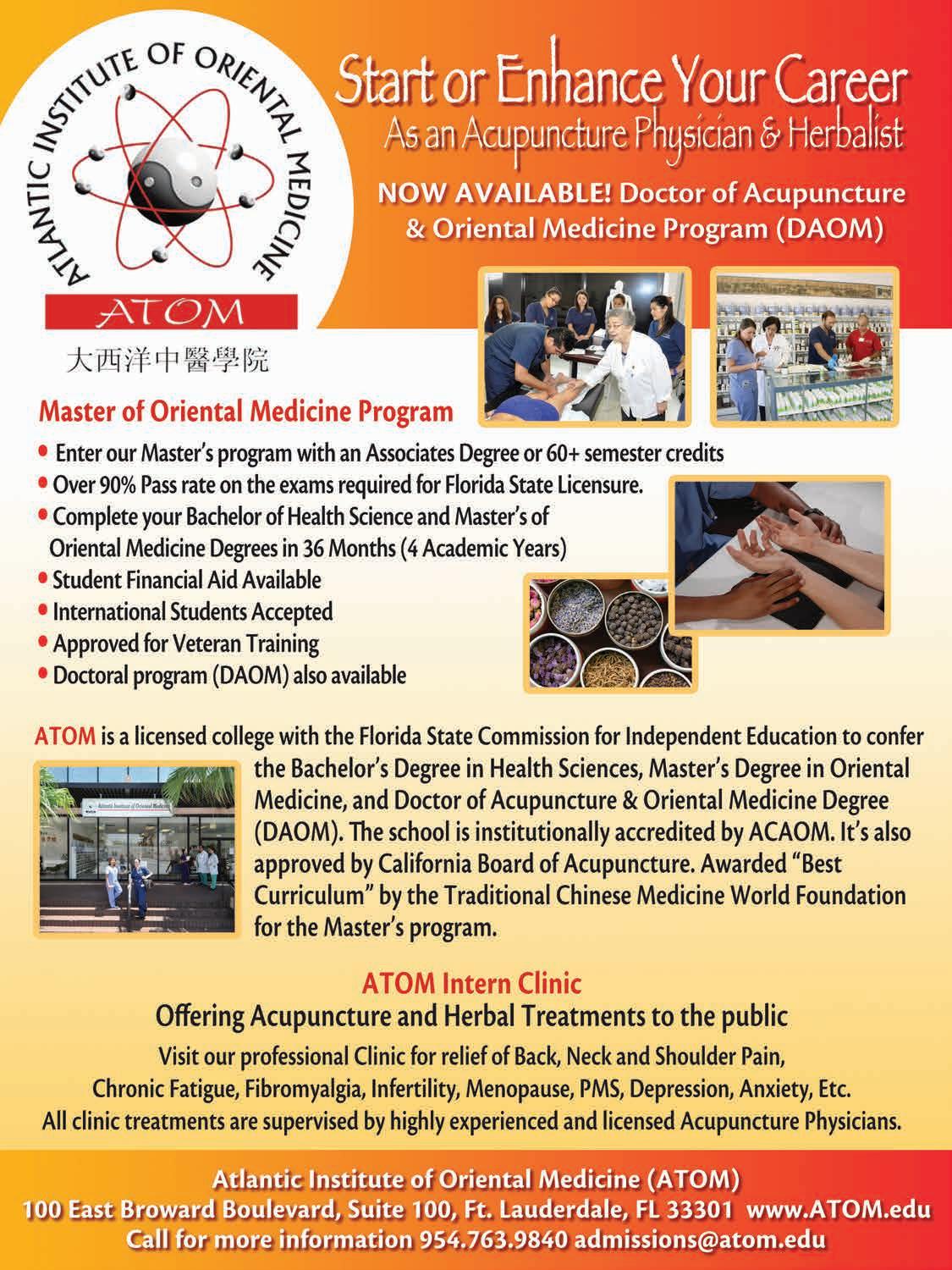 Atlantic Institute of Oriental Medicine (ATOM) Intern Clinic is Open to the public! Experience the benefits of Acupuncture & Oriental Medicine. Low-cost acupuncture and herbal treatments. Students supervised by Licensed Acupuncturists. Open Mon-Sat. Appointments: 954-7639840 ext. 201, 100 E Broward Blvd, Suite 100, Ft. Lauderdale. ATOM.edu