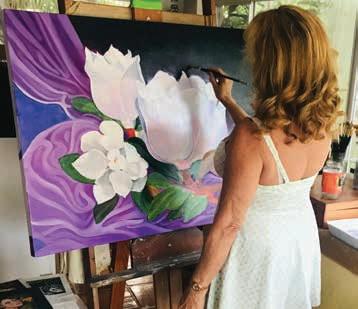 One of the oil paintings is shown here in the photograph of Bender working in her studio. The piece, titled Magnolia ‘Lil Jewel, is embedded with Swarovski crystals and signed in the upper right corner with bugle beads, along with symbolic charms of a skull and a butterfly. The other oil painting to be shown is a framed diptych (two panels) titled Mistral